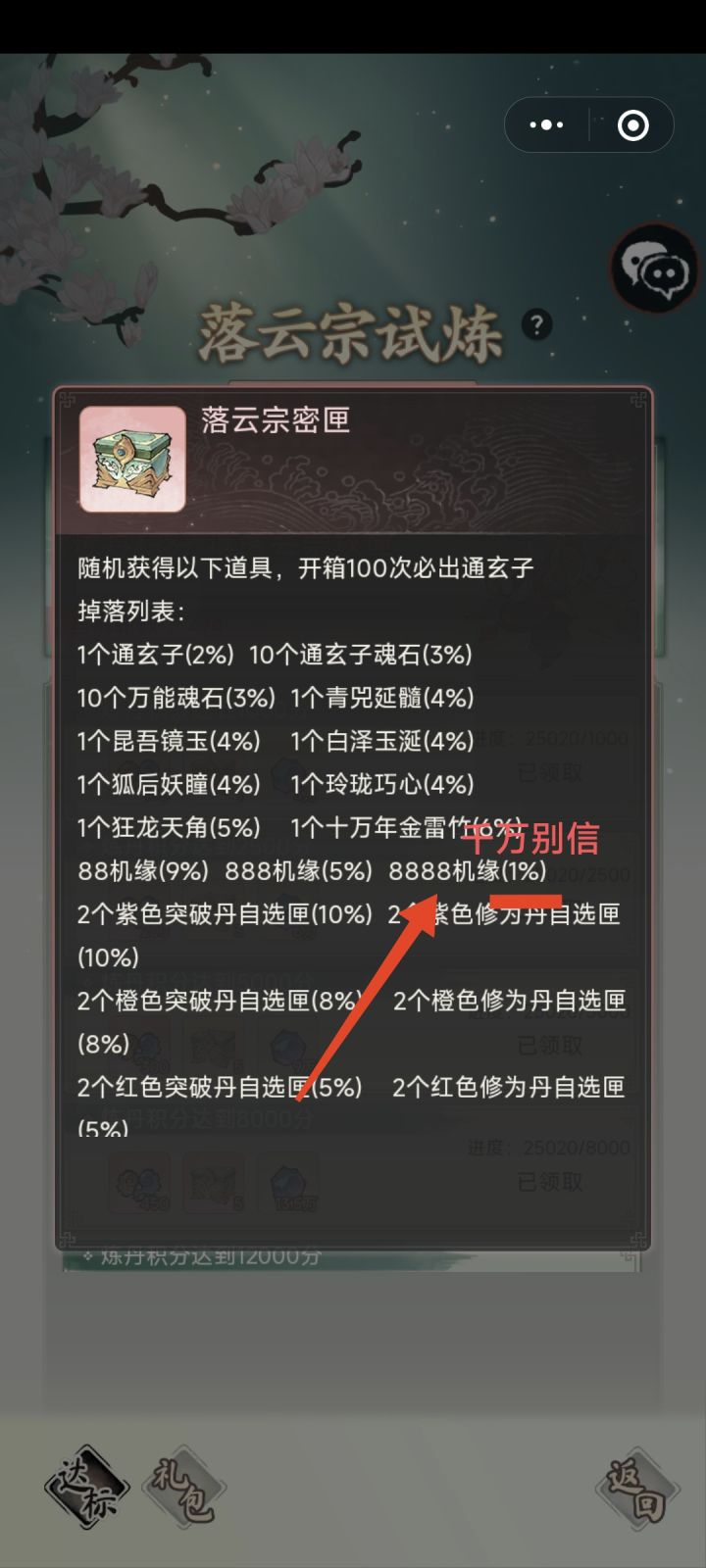 跟各位萌新分享一下有关落云宗试炼,天元斗技达标箱子奖励里8888机缘的秘密:前期入手时8888比较容易开出,萌新期过后,氪的越多,越不容易出,跟概率无关,据统计,已经有很多老玩家连续两月没开出过8888机缘了,入坑请慎重