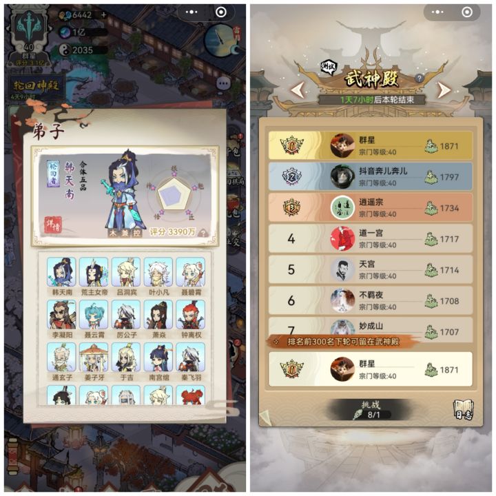 起先在朋友圈不小心点进这个广告,然后直接打开小程序了,接着就被封面的画风吸引了,一个很令人神往的场景,愣了一秒进入游戏后发现画风很吸引我有点类似江南百景图,我就想着玩几分钟吧。然后开局就抽到三个韩天南,两个秦星,一个通选子,当时不了解,进群后发图问阵容搭配,然后就被骂了🌚后来才发现,欧皇竟是我自己🌚,然后我就氪了几个技能,接着就出了叶凡,三个左慈,……从此直接上头了,连肝了五天,第三天韩天南三觉