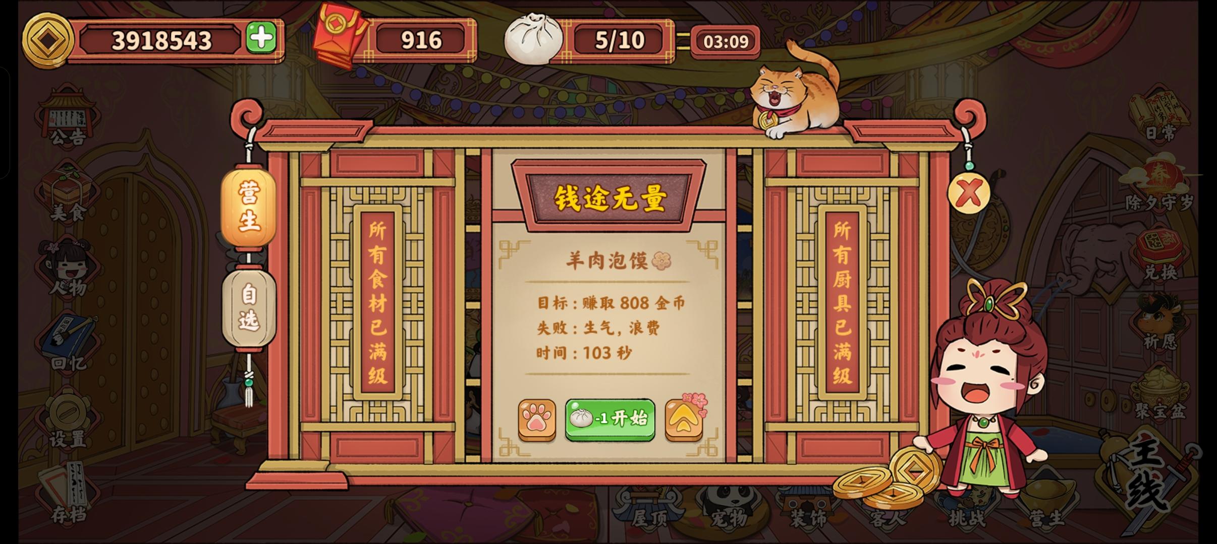 首先跟随主线完成关卡,用铜币升级食材与厨具从而达到新关卡。完成主线解锁日常(可得大量铜币)与事件(可得中国结兑换服饰)。事件给的最多中国结简要概括:(12中国结)血刃老人事件选择:飞鸿剑,有埋伏赵红鸾生日事件选择:野桂花,追上去云梦渺事件选择:让她走,开武馆周青荷试炼事件选择:丢金子,奇怪声音朱家玉佩事件选择:抓吧,放了少女红娘事件选择:掌柜在,也好其次就是宠物选择方面,如图,看准
