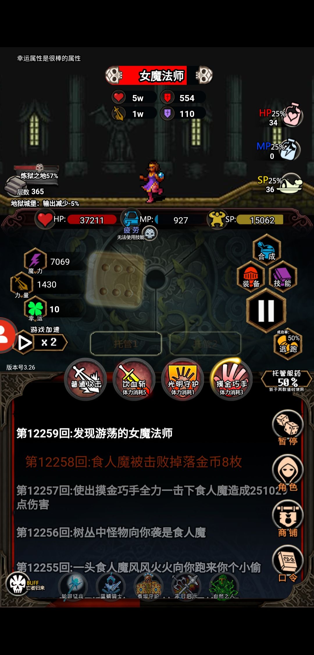 首先三维指血、蓝和体力,善恶值对于事件触发影响很大。幸运值隐性影响(骰子大点数几率变大,影响方方面面),总之越高越好,但也有例外,如果命运金币抛到幸运-1之后很可能得两件晦气装和一块玻璃(至少对我个人而言是这样),而晦气装可以合成绿意装,刷属性有用。 有什么可以刷属性呢,这留到后面的事件和装备篇说。这篇就简单一点 减伤机制目测是乘法,也就是实际伤害=原本伤害×(1-减伤A)×(1-减伤B)×……×