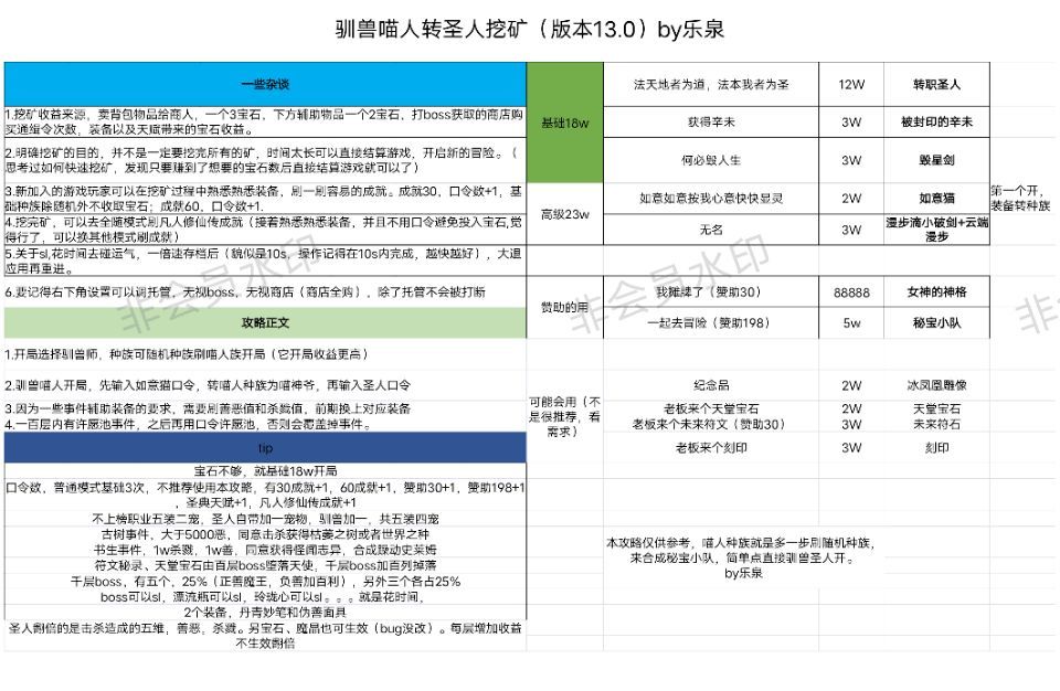13.71版本,喵神爷会被覆盖了,不用先喊如意猫转种族了。 这攻略就看看挖矿有哪些装备和道具吧 三张图挖矿建议,挖矿辅助,挖矿装备18w就开始挖,钱多一点2w先喊如意猫装备上转种族,1w5多22500收益。无名看自己心意,挖矿就注意三个事件,前期的许愿池(一百层上下波动,看脸),5k恶的大树,1w善1w杀戮的书生 其他直接托管圣人挖矿要注意的层数就是一万层,炼狱可能会打不过(复活会暂停)或者时间比