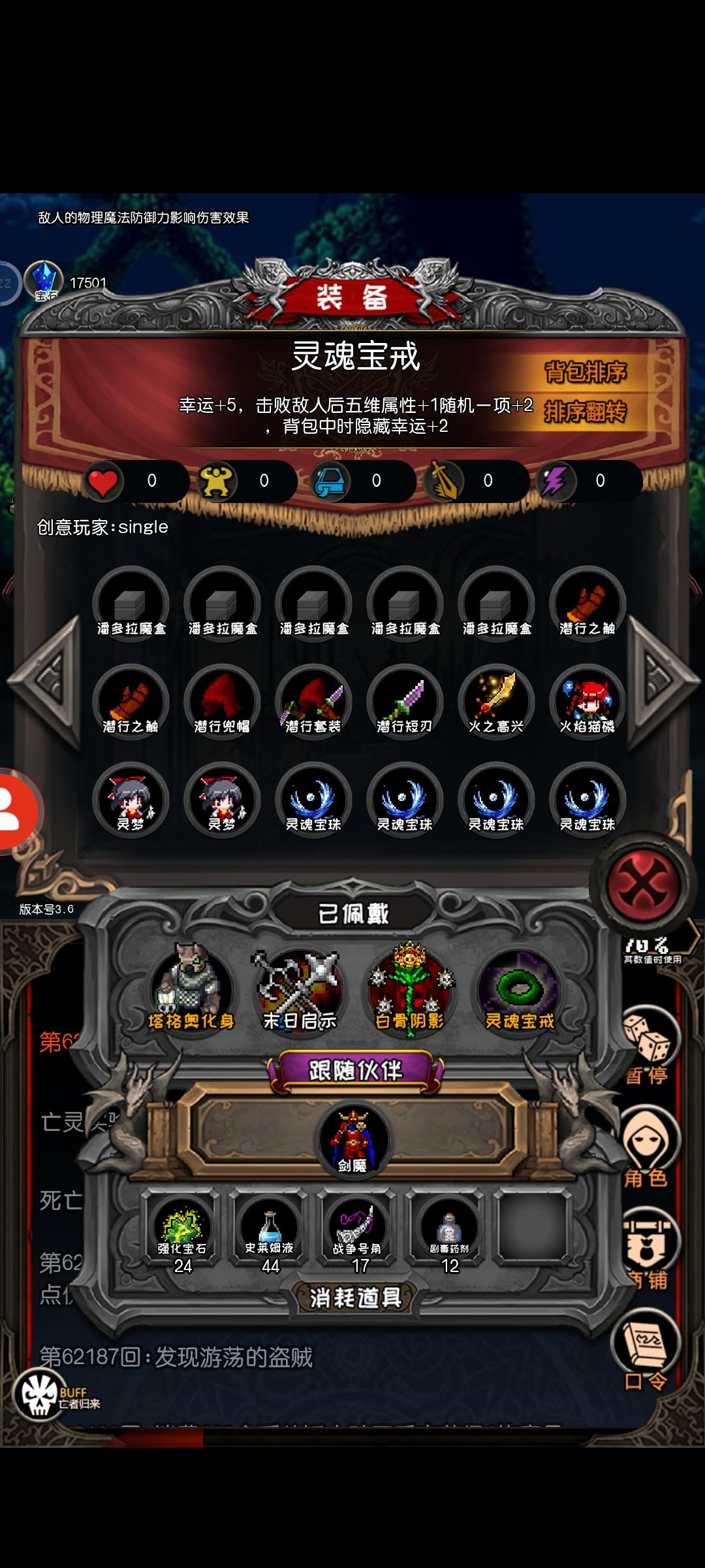 核心:堆血、减伤、幸运(不强求);生命百分比伤害;箱子、丹青sl。 (作者大大已经预告后续版本要消除sl空间啦,所以也不用太纠结这个取巧操作了) 关于达到转职13点幸运要求: 1、真.圣剑 是个好东西 真.圣剑 幸运可以叠加,带四把就+8,简单粗暴不做作,再补点锦上添花即可。 所以,白银之刃 和 黑暗之刃 遇到就别错过,缺强化石直接商店买。 2、许愿池建议 幸运指环 除非运气极佳,百层内做 命运之