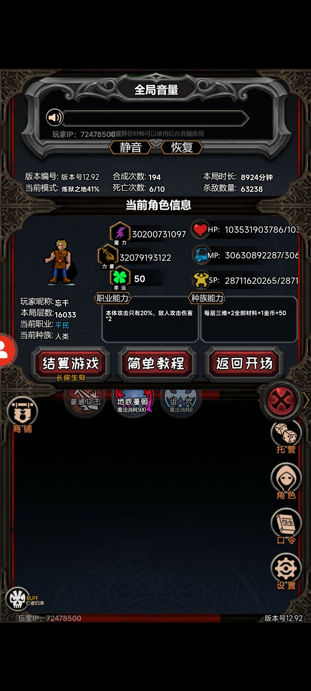 前言:我自己玩的也不算很久,200多个小时,如果有说错的地方,欢迎评论区大佬指正。 种族:人族(1500层进化成万物之灵) 职业:驯兽,武器 强力推荐驯兽(因为武器上限虽然比驯兽高,但是玩起来太麻烦了,我玩了一把就不想玩了) 这边默认是有30元赞助,因为前期节奏很重要,开局先鸽子王sl个千机伞,然后去商店买宠物蛋,整个史莱姆(没有问题也不是太大)开局口令:金币,面具,魔理沙,妖梦,匕首,骨钉。这样