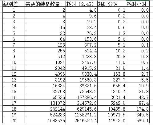 装备很重要,好的装备是打怪推图的利器。 这个游戏没有怪物掉落装备,而是由宝箱一个个刷出来的装备合成,两个同等级的合成一个高等级的装备。宝箱刷出来的装备是基础等级基的,础等级随推图提高而提高。 合成装备的时间由目标等级和基础等级的差值决定,另外宝箱刷新时间最快为2.4秒。如果基础等级11级,合成12级的装备需要两个11级,那么需要4.8秒,以此类推。 合成等级和基础等级差10级以上的,大家慎重考虑合成,毕竟耗费的时间太长了。