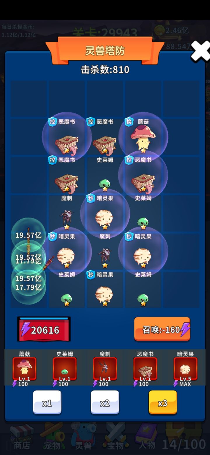 话不多说,我直接先上图如图所示,全部一星不用合成(运气好),如果运气差点,可能需要合成几下,升级也只需要升“暗灵果”。好了,我们开始说关键1必须有“暗灵果”这个是关键,因为可以秒杀2安排2个或者3个等级最高弹射次数最多的攻击灵兽3如果只安排2个攻击的,可以安排一个“恶魔书”传送回起点或者减速眩晕的控制灵兽4为了方便成型还有减少翻车几率,需要一个“蘑菇”,负责换位操作如下:我想你们也