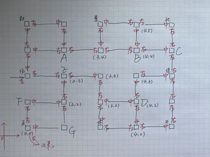⬆️ 手绘了一张地图,说明如下: 1.以左下角生门为坐标原点(0,0)建立坐标系 2.方框代表房间,周围的左中右代表该房间的路 3.A-G代表初始女鬼的位置 4.后文的路径说明中的表达方式的优先级是,房间以八门名称优先,次以坐标。 5.操作步骤()中的“左右中”代表遇到女鬼时的操作方向,即向左、向右、向中(原地返回);而操作步骤中未有括号标示即为房间路径。 6.遇到女鬼记得立刻返回,尤其是在中洞,