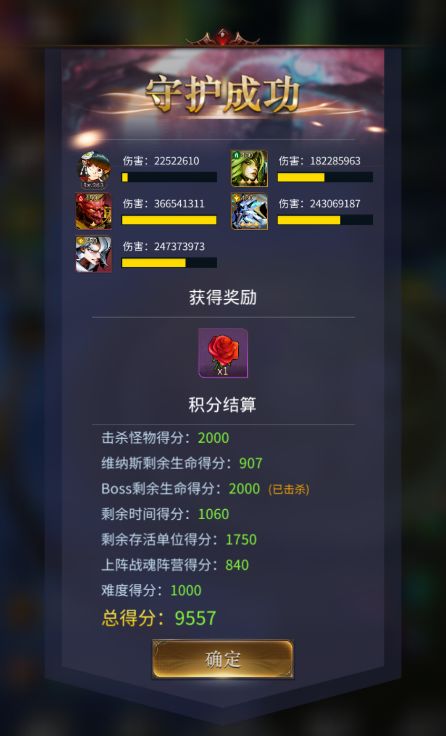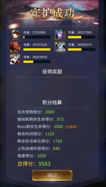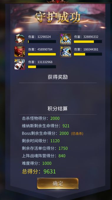 守护维纳斯-简单难度9631不知道算不算高分可以对比下面三图,评分维度:①击杀怪物得分(通关2k)②Boss得分(通关2k)③维纳斯剩余生命得分(我原本想着用盖亚奶保证血量,后来发现打的快才是硬道理,我奶不动)④剩余时间得分(还是那句话,打得快,分数就高了)⑤上阵战魂阵营得分(这个还要研究,目前没弄懂)⑥难度得分(简单1k)总的来说,多试试几套,打的小怪掉的【神印】直接给主力输出,但是有上限,所以建议【攻击、吸血、暴击】优先给输出