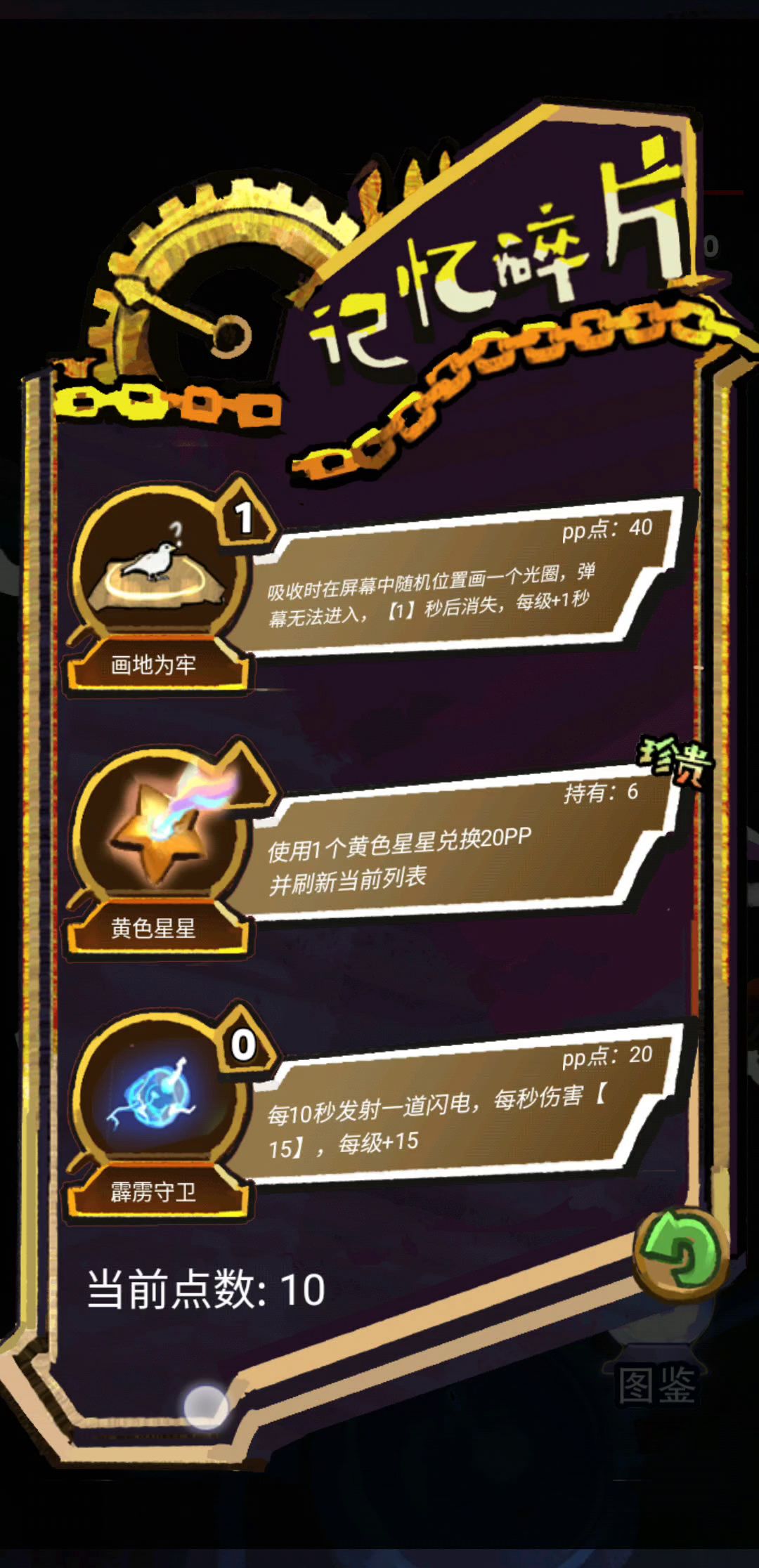 核心碎片只需要两个,+15%攻速,连击50次暂停3秒 吃到了这两种碎片之后,商店里就狂升这两种吧,升到一定程度就会有这种效果。 注意新的一关刚开始时不碰屏幕是不会自动发射子弹的,视频中第二个boss就是吃了这个亏没有连击到。 这里反馈两个bug 1. 时间暂停结束前又一次触发时间暂停的话是不起作用的,比如说我时间暂停碎片升到三级,50连击暂停5秒,而第四4秒时我又达成了50连击,那么它不会刷新这个持续时间,而是再过一秒就停止了暂停时间 2.也不算是bug,只是我如果这个超高攻速的时候人在屏幕底部,那么会导致同屏弹幕数量超多,导致手机非常卡,这点不知道能否优化