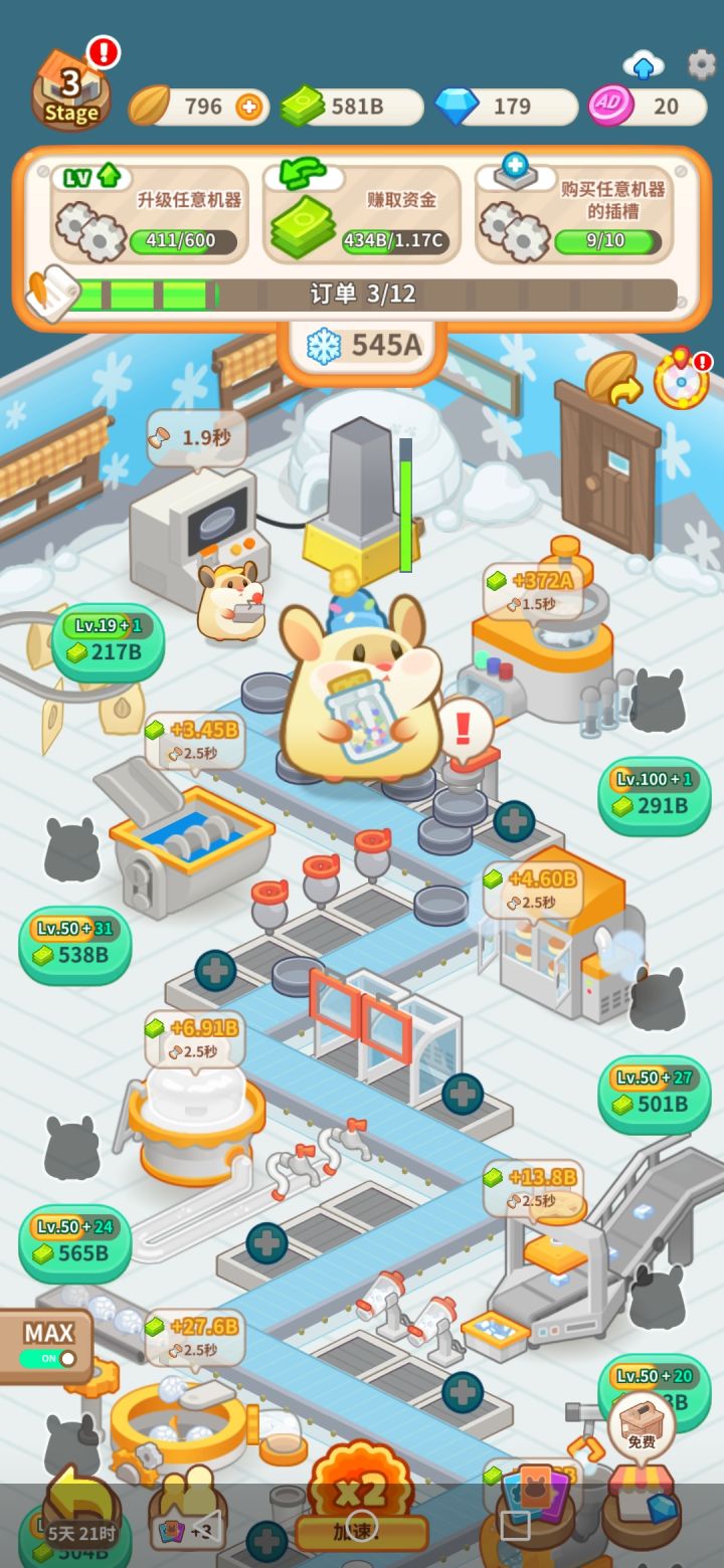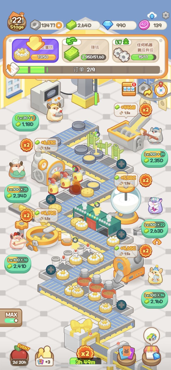 整体的界面是这样,玩法很简单,一个造型的蛋糕对应一家蛋糕工厂,也对应一个关卡。介绍:每个关卡都有不同的做蛋糕的机器,比如烤箱 搅拌机。每台机器对应不同的仓鼠。获得仓鼠:仓鼠来源是开箱子抽卡。开箱:箱子有三种类型,一个是木箱(可以拿3个奖励),一种是高级箱子(可以拿6-10个奖励),接着是稀有箱子和超稀有箱子。在完成任务时会获得箱子,也可以每几个小时看一次广告获得箱子。仓鼠升级:需要消耗第一