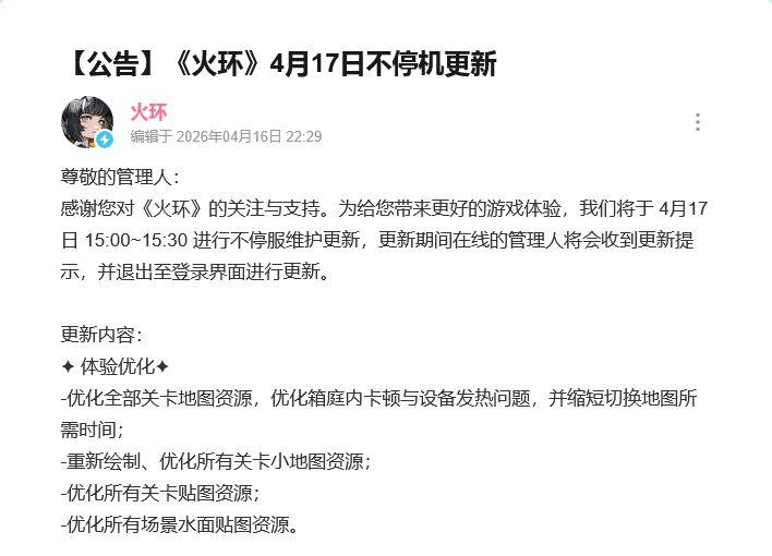 😡 火环再次优化更新无实质内容!玩家信心持续减弱 由月胧吟网络研发的二次元横版动作手游《火环》 近日有新信息传来,官方近日再次对游戏进行更新,更新内容主要包括优化全部关卡地图资源、改善箱庭内卡顿与设备发热问题、重新绘制所有关卡小地图资源及贴图等。从表面上看,这是一次意图优化玩家基础体验的常规更新。 然而游戏没有实质新内容产出的行为,令玩家对游戏未来感到担忧 据了解,此前《火环》游戏开发方