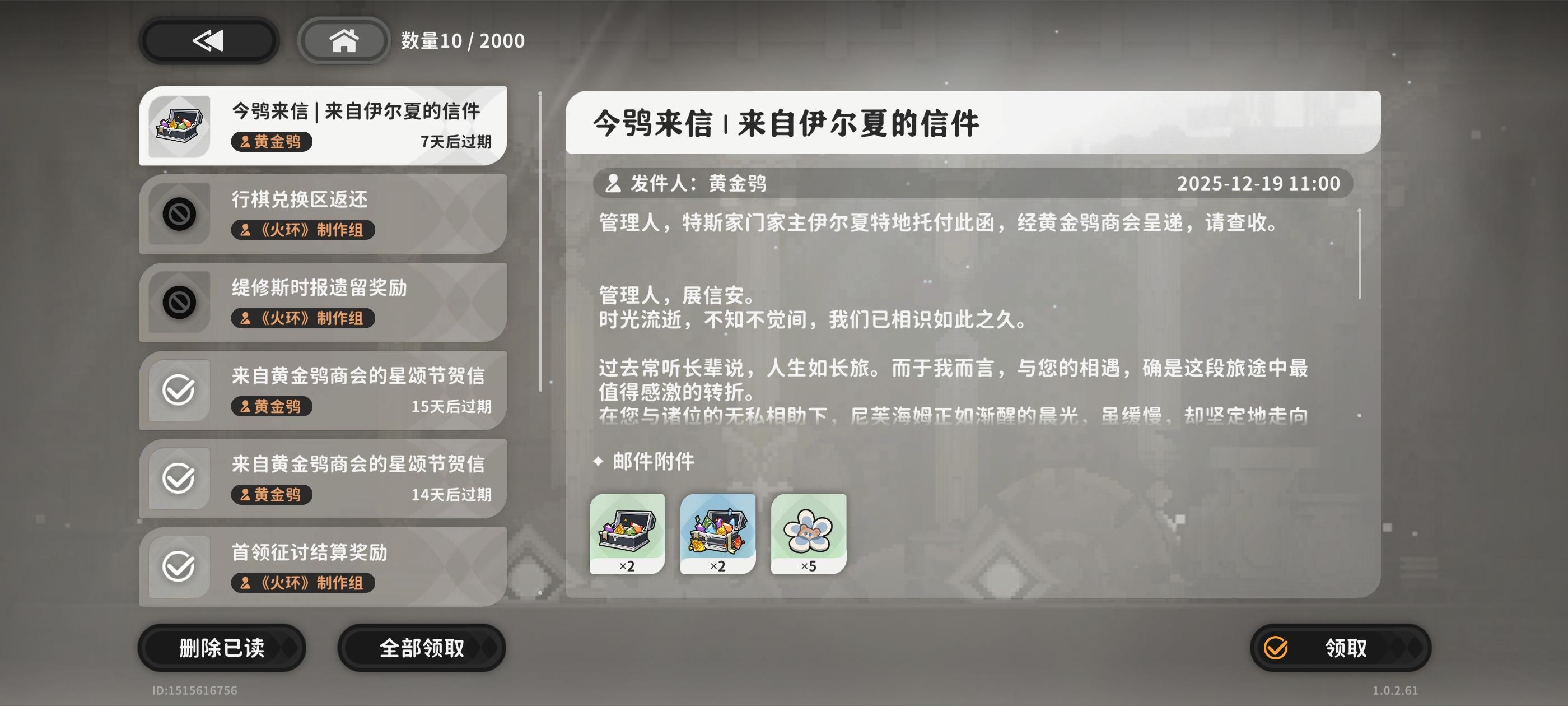 致管理人:星颂节如期而至。 自十二月第十七次日落起,至次年一月第三次日出,缇修斯大陆的冬夜将被星火点亮。 感谢这个冬天与您在缇修斯相遇,本次黄金鸮商会为您准备了以下好礼: ➤评论抽奖 评论本条动态,并留下您的星颂节祝福。我们将随机抽选管理人送出以下奖品: 【纳叶礼盒*1】(1位) 【随机角色挂件*1】(3位) 本次活动将于1月16日开奖 ,请关注后续官方消息。 ➤游戏贺礼 此外,