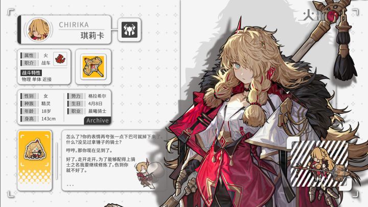 晨曦骑士琪莉卡是一个元气满满的暴力选手,看似娇小的身体里隐藏着超乎常人的怪力,喜欢别人夸奖自己,但是被夸奖后却又不能率直的接受,而是会用一种稍显傲慢的态度去回应。在战斗中,琪莉卡活脱脱像一个莽夫,凭借着大锤带来的重量优势,经常能在战场上为团队打开一道缺口,这莽撞的战斗方法也使得琪莉卡经常陷入危险的境地,只是不服输的她,即使面对强大的敌人也不会选择撤退,无论被击倒几次都会挣扎着重新站起来,并用她一