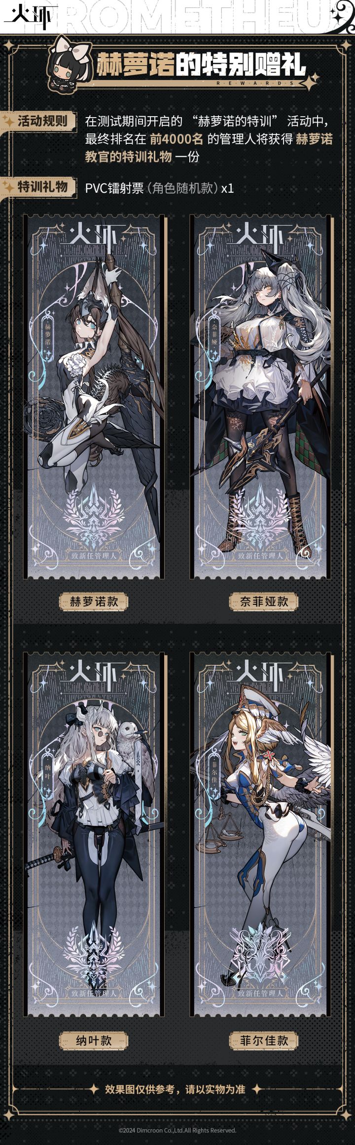 “听说在你们那边,新来的学者都要参加一次训练?嘿嘿,我也给你准备了特训哦——干嘛露出那种表情!打起精神来,我可是有好好准备奖励的哦~”【活动预告】焕火测试期间,各位管理人阁下可以通过参与游戏内限时活动“赫萝诺的特训”活动以获取积分,我们将为最终排名前4000的管理人赠送特别赠礼。【奖品列表】角色PVC镭射票(随机款)*1奖品配送可能会有延迟,我们会尽快安排奖品发放。【发放时间】获奖名