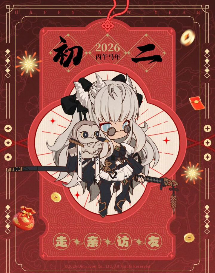 今天,《火环》官方推出丙午马年初二主题新春贺图,同时为玩家发放黄金鸮商会专属春节礼包码。 本次初二主题贺图以正月初二走亲访友为核心节日脉络,整体采用红金撞色的国风设计,融入烟花、福袋、金币等新春标志性元素,氛围感拉满。贺图核心视觉为Q版造型的游戏角色,其身旁相伴着艾洛尔与黄金鸮,角色形象精致可爱,画面上方醒目标注初二与2026丙午马年字样,下方则印有走亲访友的节日主题文字,完美契合正月初二的传