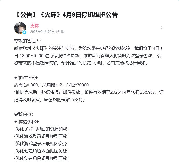 尊敬的管理人:感谢您对《火环》的关注与支持。为给您带来更好的游戏体验,我们将于 4月9日 18:00~19:00 进行停服维护更新,维护期间管理人将暂时无法登录游戏,给您带来的不便敬请谅解。预计维护时长约1小时,若有变动将另行通知。✦维护补偿✦活火石× 300,尖啸椒 × 2,米拉*30000*维护完成后,补偿将通过邮件发放,邮件有效期至2026年4月16日23:59分。请记得及时领取,感