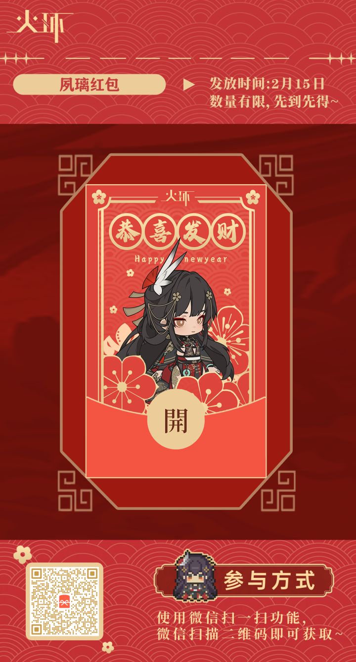 旧账已清,新簿待启。在这月圆星灿的前夕之际,我们为种火的管理人阁下准备了「Q版夙璃」主题的新春红包封面,数量有限,先到先得。 【发放时间】2月15日 21:00 请管理人阁下收下我们的心意,此新旧交接之际,谨愿您:岁岁康宁,家兴百和,前路皆坦途,所愿皆成真。 红包详情见下图