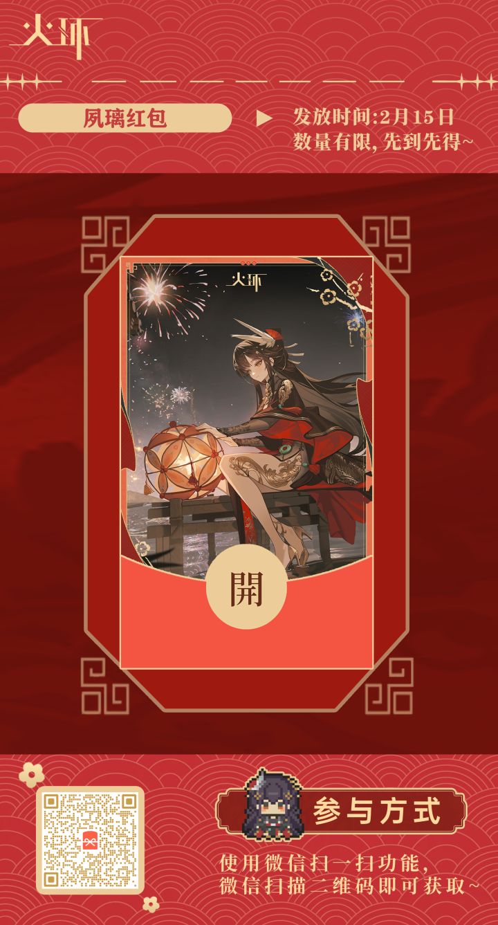 旧账已清,新簿待启。在这月圆星灿的前夕之际,我们为种火的管理人阁下准备了「夙璃」主题的新春红包封面,数量有限,先到先得。【发放时间】2月15日 21:00 请管理人阁下收下我们的心意,此新旧交接之际,谨愿您:岁岁康宁,家兴百和,前路皆坦途,所愿皆成真。 红包详情见下图