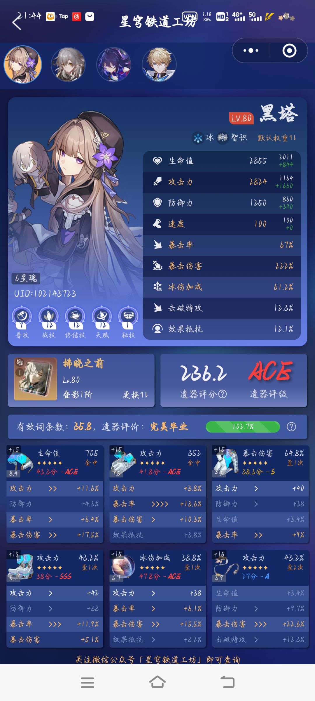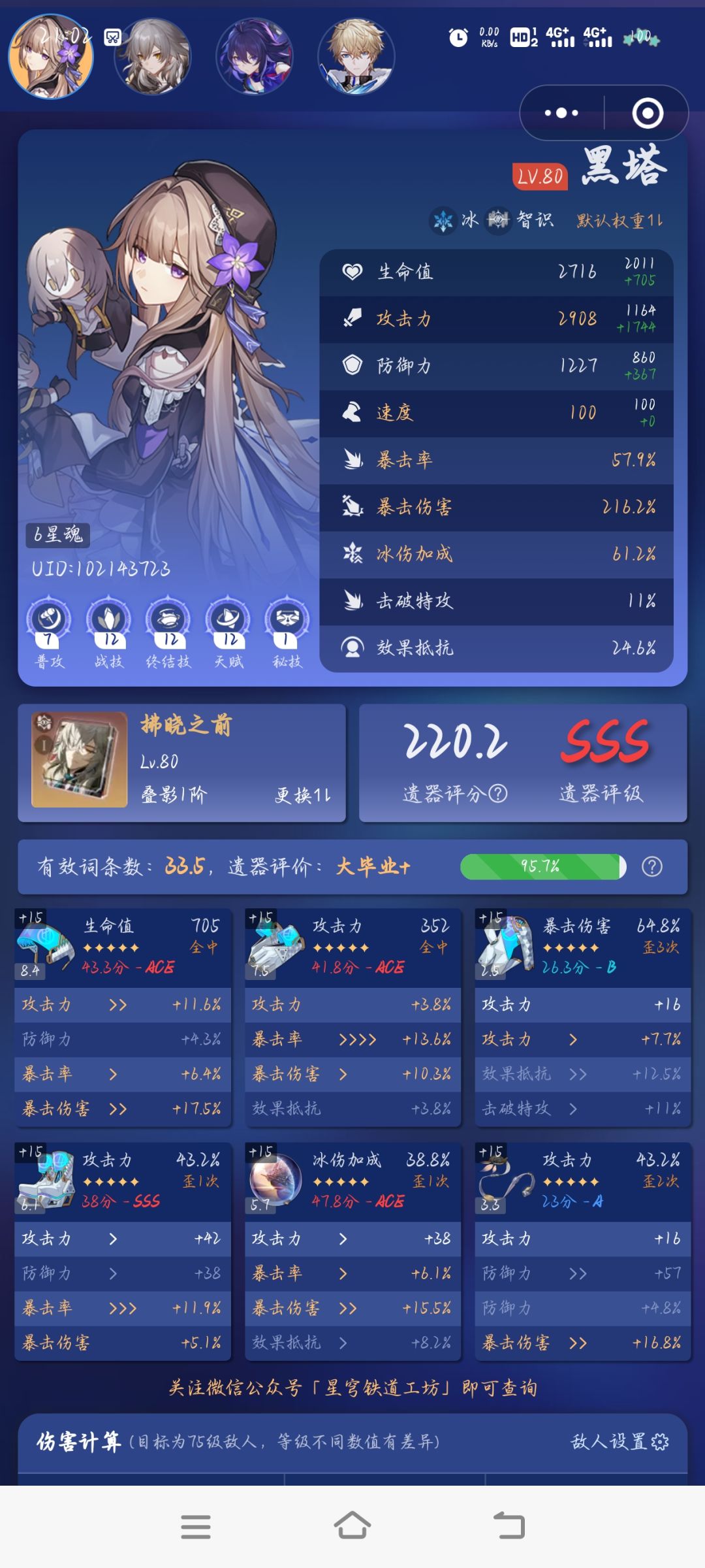 精5黑塔武器 流萤攻击白值524+黑塔武器529=1053,叠满4层64%就是674攻击力,每100点转化80%击破就是54击破。 连流萤专武60%击破都没追上,然后专武还有24击破伤害加成和减速。更别提黑塔武器还要动4次叠满而且击破增伤效果只有直伤能吃。 另外流萤打本期下半平均8次行动结束战斗。4下才叠满多少有点搞笑,更别提叠满还是不如专武。那些所谓的测评是计算叠满后10%左右差距,可是实战情况