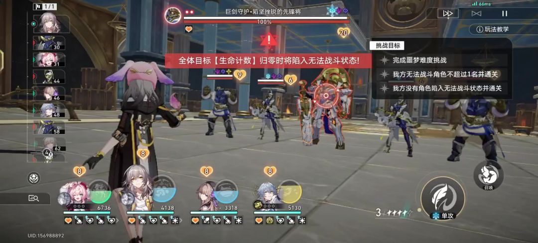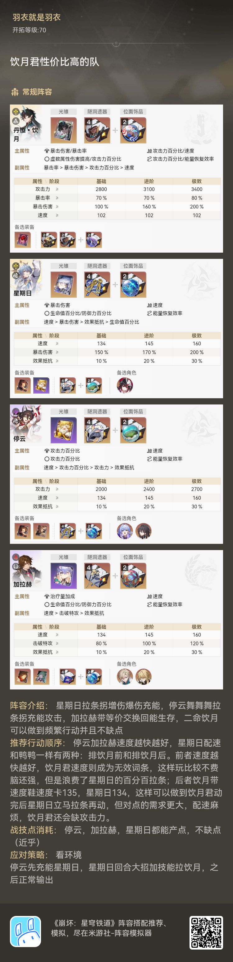 追击队:灵砂+翡翠+星期日+布洛妮娅。 击破队:灵砂+翡翠+星期日+同谐主 一速输出装备的灵砂,翡翠不用速度鞋子换成攻击鞋子,剩下的随意,主要伤害是翡翠追击灵砂,速度不用太快,而且灵砂的召唤物也算额外的翡翠充能,加上星期日布洛妮娅拉灵砂,可以多次给翡翠充能,比黑塔稳定且次数多 只抽到了光秃秃的星期日,这个阵容对星期日的配置没任何要求,唯一缺点是得手动
