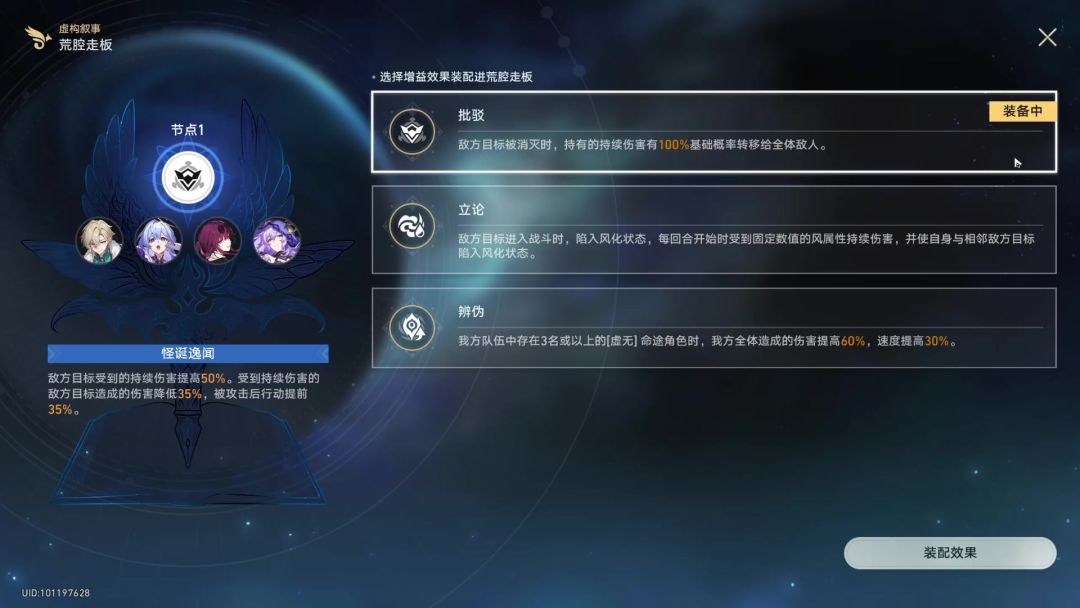UID:100726351 2.0第一期虚构叙事刷新,同时也是这个玩法的第三期了。通过前两期,大家应该都能感受到智识角色,尤其是银枝、黑塔和姬子这几个角色对于虚构叙事的重要性。那么这一期是否还是用这些角色攻略为优先呢?接下来就来逐点分析下。 【场地buff】怪诞逸闻也就是本期的场地buff,效果为追加攻击会累积伤害值,累积到100%时会对敌方额外造成一次固定数值的全体伤害。这期buff无疑最适配追