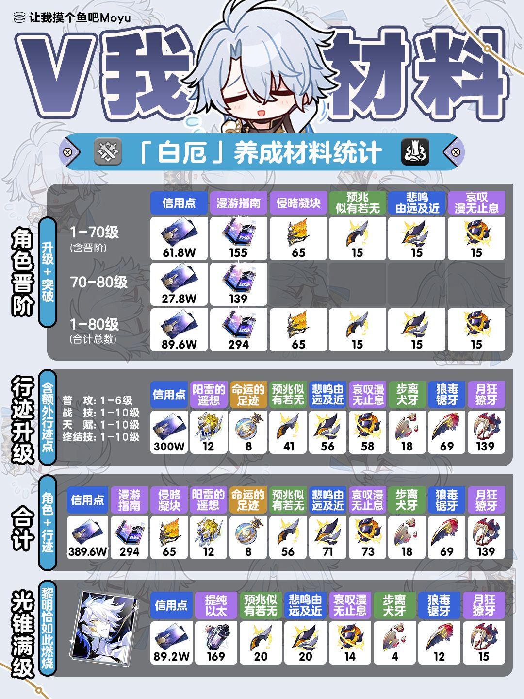UID:104347362 将将!摸鱼来啦~ (。•̀ᴗ-)✧ 3.4上半即将上线的5星毁灭大C! 『白厄』的【角色&行迹&光锥材料】全收集来噜~ 宝子们速速收藏准备,记得有新材料,不要刷错材料哦! “V我材料,让你知道 ▇▇▇▇▇ 的威力” 【角色晋阶部分】 按照1-70级(含突破材料)/ 70-80级 / 1-80级总合计材料 分别展示 【行迹升级部分】 按照鱼酱推荐的方案展示: 优先提升终结