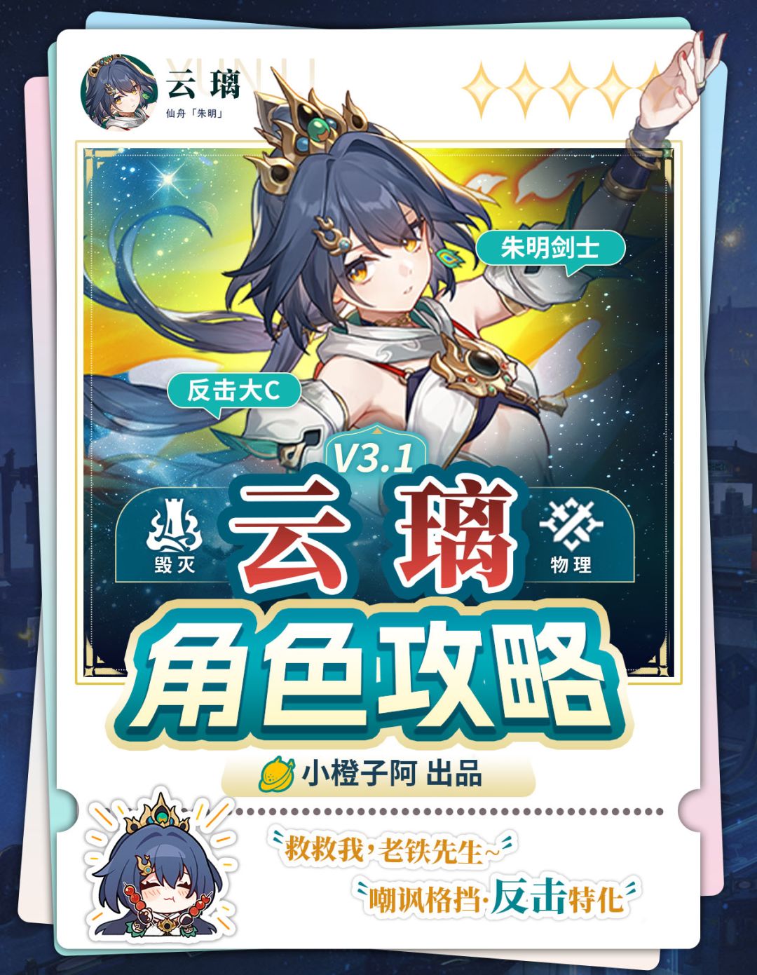 UID:104802274 哈喽喽,这里是小橙子阿,本期是将是仙舟「朱明」的猎剑士云璃的角色攻略!全文将详细地讲解云璃的技能机制、光锥选择、星魂解析、遗器以及队伍搭配。 「我叫云璃,是朱明仙舟的剑士。如果你有剑器在手,请务必拿给我看看,谢谢!」 「云璃」是一位物理属性的毁灭命途角色。作为毁灭命途的云璃,与克拉拉机制类似,是一位受击反击类型的角色。主要是通过天赋的被动进行反击,并且根据时机手动释