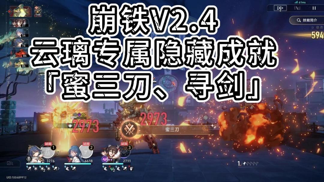 UID:100489912 开拓者们,大家好啊 这里是天龙筮,本期带来的是2.4版本中「云璃」的专属隐藏成就「蜜三刀、寻剑」获取攻略 获取地区:匹诺康尼-晖长石号 开放时间:无 成就获取难度:⭐⭐⭐ 成就耗时:5~10分钟左右 成就分类:战意奔涌 「蜜三刀」 我们进入试用关卡 开启战技后被金人攻击进入战斗「不要主动攻击」 然后第二次堪破灭会有提示 第三次堪破灭在金人攻击前开大即可#崩坏星穹铁道