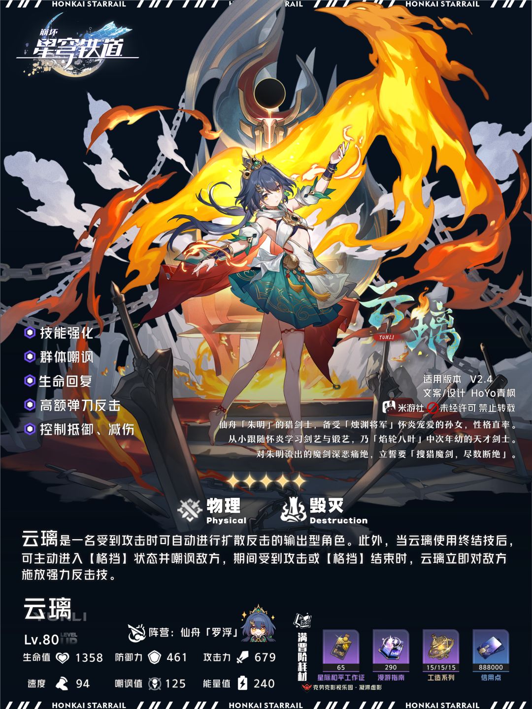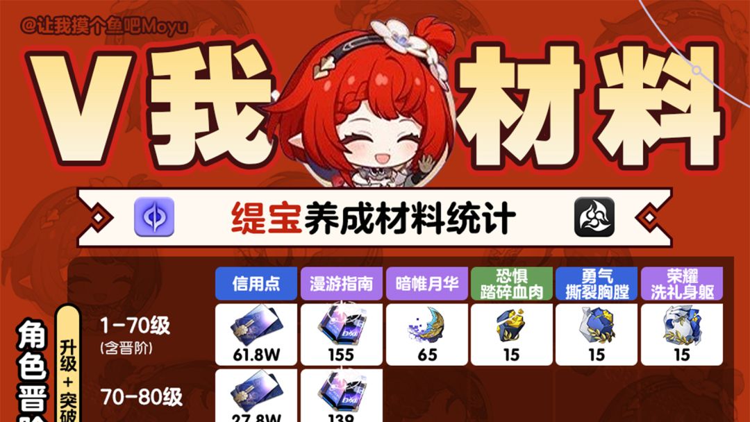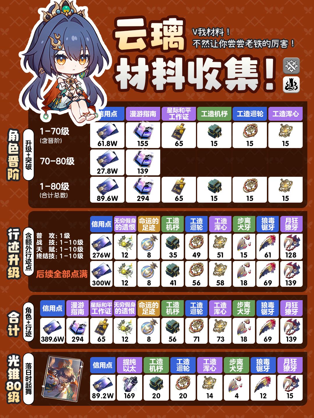 UID:104347362 将将!摸鱼来啦~ (。•̀ᴗ-)✧ 2.4即将上线的五星up!『云璃』的【角色&行迹&光锥材料】全收集来噜~ 宝子们速速收藏准备,记得不要刷错材料哦! “V我材料,不然让你尝尝老铁的厉害” —————— ฅ՞• •՞ฅ ——————— 【角色晋阶部分】 按照1-70级(含突破材料)/ 70-80级 / 1-80级总合计材料 分别展示 【行迹升级部分】 按照摸鱼推荐的方案
