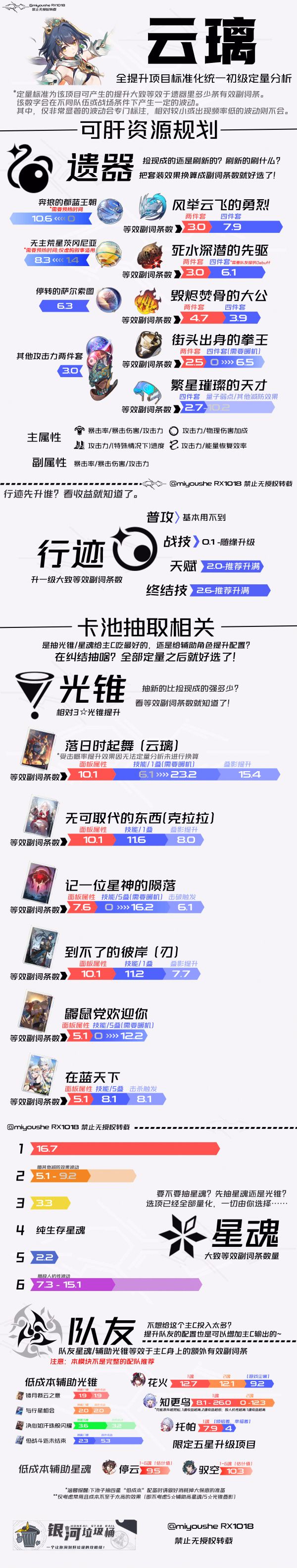 UID:101286024 大家好,这里是RX。 不像常规一图流以【提升角色单人效能】为核心,这篇一图流是以一种全新的思路——【综合规划可用资源】为核心构建的。 通过设置等效遗器副词条数量这个标准,我们得以将每一个培养项目直观(虽然不太准确)地量化成简单的数字,并用这个数字为各位开拓者规划自己手上的资源提供初步的指引。 这是RX对这一思路的第一次尝试,如果有没讲明白的地方或者优化建议,也欢迎各位在