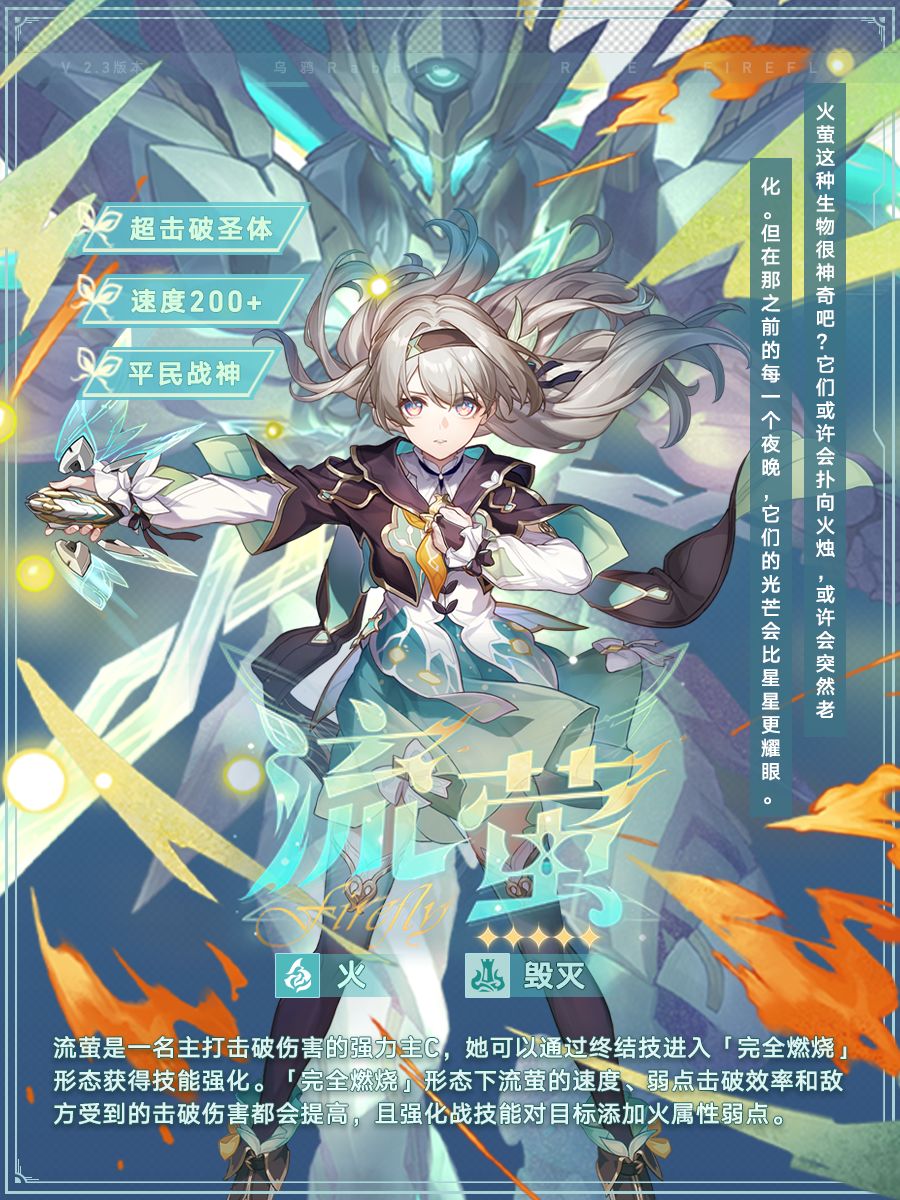 UID:100557114 流萤是一名火属性-毁灭命途角色,是现版本当之无愧的击破大c,先天超击破圣体,通过操纵装甲「萨姆」(火萤Ⅳ型强袭战略装甲)进入「完全燃烧」状态进行高规模击破输出,在此状态下有着超高的行动速度,并强化普攻、战技的输出形态,大幅提升技能的削韧水准,并自带高额的击破易伤从而进一步提升超击破伤害表现,同时具备对敌方挂火弱点的能力,即便无弱点环境下也可无视弱点削韧,不会影响其正常发