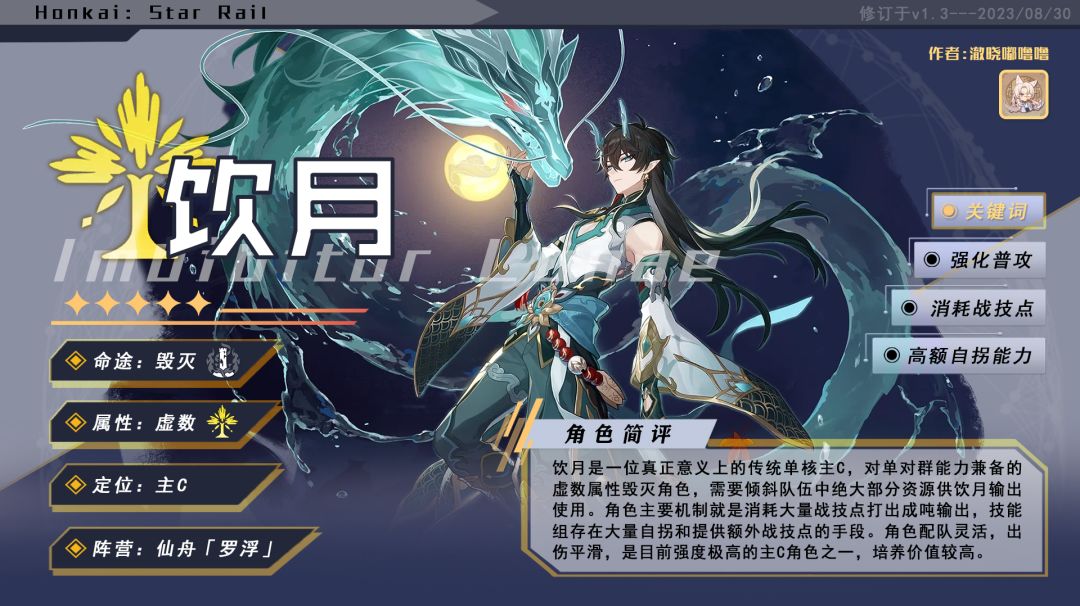 UID 100760002 各位开拓者好,这里是澈晓嘟噜噜。 新角色「丹恒·饮月」终于实装上线,耳畔又好像响起《水龙吟》,过往潮汐将我拉回1.2版本劈海的瞬间。饮月自官方爆出角色形象后就始终处于超高人气,不少开拓者翘首以盼,相信有不少人已经抽到了饮月,但却不知道怎么培养。 今天为大家带来「丹恒·饮月」的全方位攻略一图流,详细讲解「丹恒·饮月」的配装思路、技能机制、星魂抽取以及配队推荐。 本期饮月攻