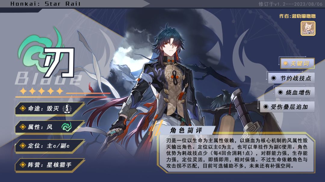 UID 100760002 各位开拓者好,我是澈晓! 「刃」的卡池即将结束,在这样一个不合时宜的时间点,澈晓为大家带来「刃」的全方位攻略一图流。本期算是对后续开攻略新坑的一个尝试,未来实装新角色时澈晓会为大家及时更新攻略! 关于之前已经实装过的角色,后续澈晓也会抽时间逐渐补全的,大家放心! 那么话不多说,「刃」全方位攻略奉上! 先上一图流,万事不用愁。 后续还有对角色多方面的详细分析,想要仔细