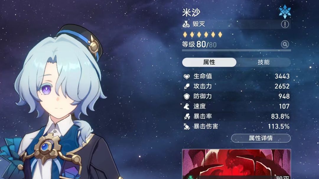 UID:100726351 四星冰系毁灭新角色米沙上线。米沙的技能有不少比较独特的机制,比如终结技可以让队友帮忙叠攻击段数,还有冻结控制等等,不过因为伤害都是攻击力倍率,并且因为额外能力的关系,他的培养思路还是和大多直伤输出相同。下面就来聊聊该如何培养米沙。 【技能简析和加点建议】米沙最关键的是他的大招,叠满10段后,无论是伤害,还是冻结控制效果都不错。虽然大招冻结基础概率较低(10级是20%),