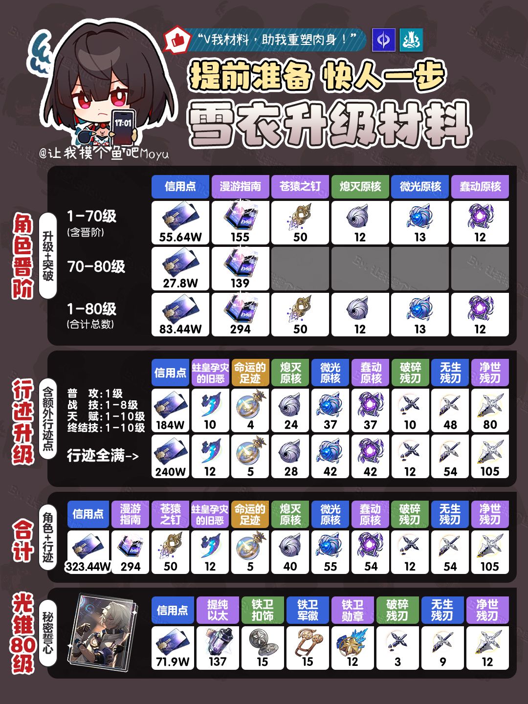 UID:104347362 将将!摸鱼来啦~ (。•̀ᴗ-)✧ 1.6上半即将上线的四星陪跑! 寒鸦姐姐——『雪衣』的【角色&行迹&光锥材料】全收集来噜~准备抽取的同学速速收藏准备起来吧!“V我材料,助我重塑肉身” —————— ฅ՞• •՞ฅ ——————— 【角色晋阶部分】 按照1-70级(含突破材料)/ 70-80级 / 1-80级总合计材料 分别展示 【行迹升级部分】 按照摸鱼推荐的方案展