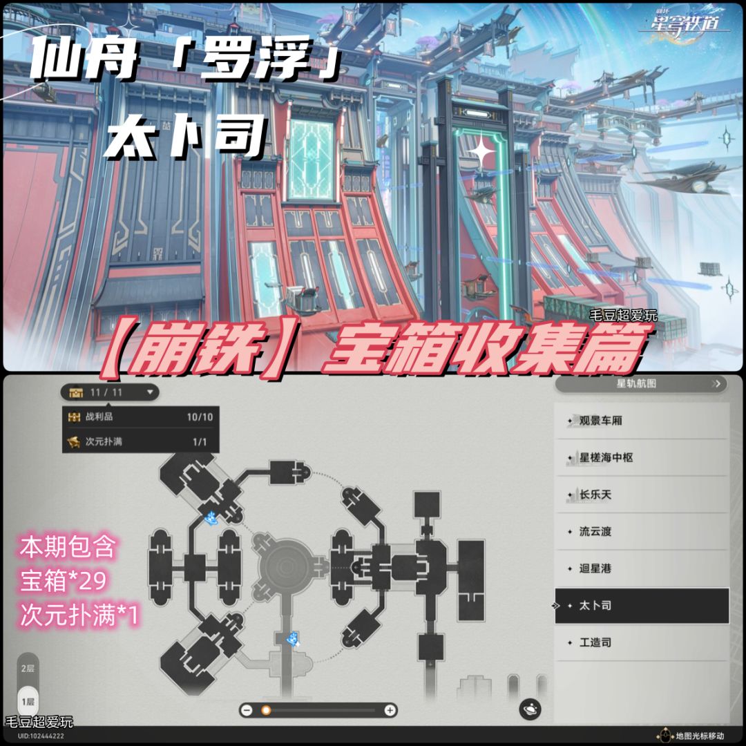 【崩坏:星穹铁道】 UID:102444222 这里是毛豆,本期毛豆整理了仙舟罗浮-「太卜司」的宝箱点位,希望能对萌新宝宝有帮助。 敲黑板,这里是进攻略前的小提示:找不到的宝箱可能是拿过了,可以通过地图左上角宝箱数量核对!地图上显示的战利品数量不包含“任务”和“机关谜题”,少宝箱的开拓者优先找黄色圈圈的箱子!宝箱、小猪的奖励都只能领一次!小猪跑掉可以通过传送或重登刷新! 下图为仙舟罗浮-「太卜司」