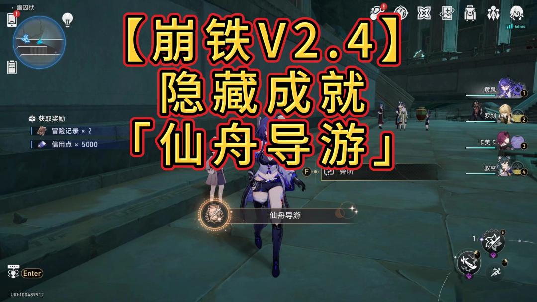 开拓者们,大家好啊,本期带来的是2.4版本中的隐藏成就「仙舟导游」获取攻略 获取地区:仙舟「罗浮」—幽囚狱 前置任务:完成开拓续闻「仙舟『罗浮』」-「明霄竞武试锋芒•上」 开放时间:2.4版本 成就获取难度:⭐⭐ 成就耗时:3~5分钟左右 成就分类:与你同行的回忆 首先我们要知道再开拓续闻「仙舟『罗浮』」-「明霄竞武试锋芒•上」最开始 我们给这两位推荐的景点是哪里,确定后再找「忘了就一个一个跑吧」