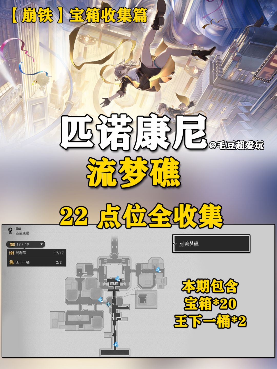 【崩坏:星穹铁道】 UID:102444222 本期毛豆整理了2.2版本新增地图匹诺康尼-流梦礁的宝箱点位,下篇共包含13-20号宝箱的收集路线,1-12号宝箱请移步上篇。 敲黑板,这里是进攻略前的小提示:开拓者需要优先完成系列开拓任务《在我们的时代里》,进行该任务时自动开启地图流梦礁,如果目标点位没有宝箱则代表已经领取。毛豆根据颜色划分了宝箱类型,钟表谜题、任务宝箱均不计入地图左上角显示的战利品