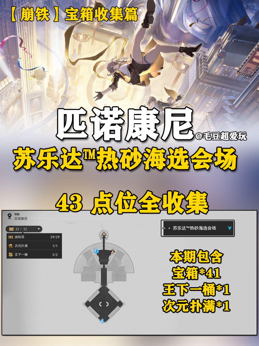 【崩坏:星穹铁道】 UID:102444222 本期毛豆整理了2.2版本新增地图匹诺康尼-苏乐达™热砂海选会场的宝箱点位,“1关篇”包含广场、第一关左右两侧的宝箱收集,以及第二关开启隐藏的宝藏线索收集。第二、三关的宝箱收集路线请前往对应的收集篇。 开拓者需要优先完成系列开拓任务《在我们的时代里》,支线任务《热砂假日》,每个关卡都分为左右两边,完成主线+支线开启全部苏乐达™热砂海选会场地图,毛豆根据