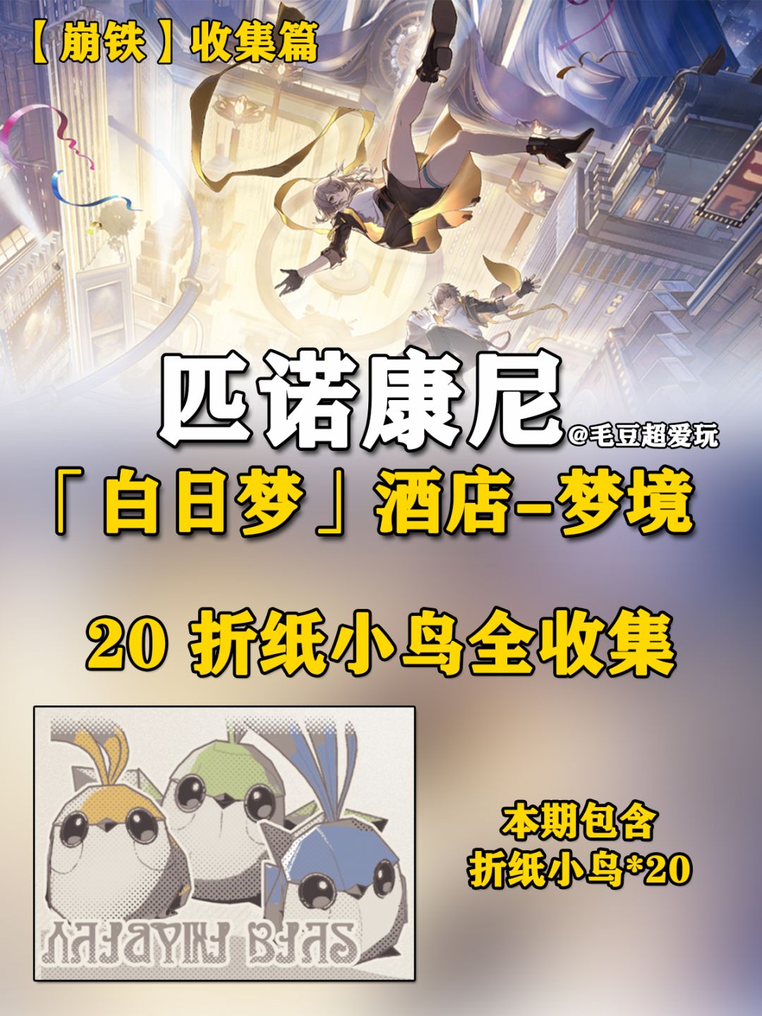 【崩坏:星穹铁道】 UID:102444222 本期毛豆整理了2.0版本新增地图匹诺康尼-「白日梦」酒店-梦境<折纸小鸟>点位,本篇共计包含20个点位的全收集,希望能对各位开拓者有帮助。 敲黑板,这里是进攻略前的小提示:开拓者需要优先完成系列开拓任务《喧哗与骚动》,进行该任务时自动开启地图「白日梦」酒店-梦境,部分小鸟需要交互3次,如果目标点位没有可交互的折纸小鸟则代表已经获取。 到此匹诺康尼所有