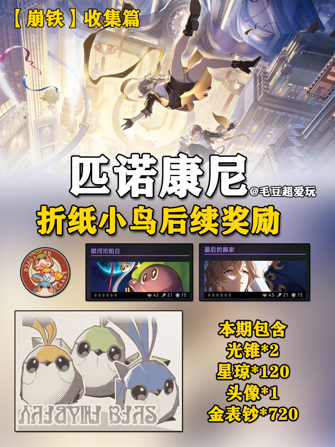【崩坏:星穹铁道】 UID:102444222 为了方便各位开拓者查漏补缺,本期毛豆整理了一下2.0版本地图匹诺康尼<折纸小鸟>的奖励汇总,本篇共计包含60个点位的全收集,希望能对各位开拓者有帮助。 敲黑板,这里是进攻略前的小提示:只有梦境地图有折纸小鸟的收集,开拓者可以在地图中<小鸟图标>处查看当前地图的收集进度,全部收集完成后需要前往目标点对话领取奖励,头像奖励需要60个点位全部收集后对话获取