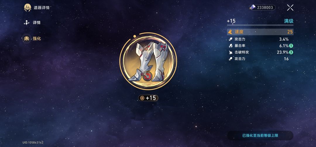 给阮梅物色一下遗器没想到除了首通送的以外只刷了一次世界8的匹诺康尼正好有一个充能绳和生命球,都是3词条看起来勉强可以强化试一下没想到还都强化的挺好,就用这俩了