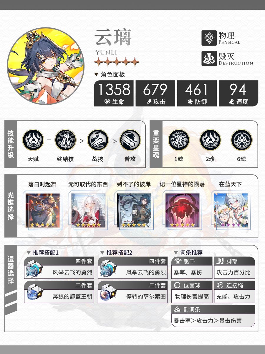 UID:104802274 哈喽喽,这里是小橙子阿,本期是将是仙舟「朱明」的猎剑士云璃的角色攻略!全文将详细地讲解云璃的技能机制、光锥选择、星魂解析、遗器以及队伍搭配。 「我叫云璃,是朱明仙舟的剑士。如果你有剑器在手,请务必拿给我看看,谢谢!」 「云璃」是一位物理属性的毁灭命途角色。作为毁灭命途的云璃,与克拉拉机制类似,是一位受击反击类型的角色。主要是通过天赋的被动进行反击,并且根据时机手动释