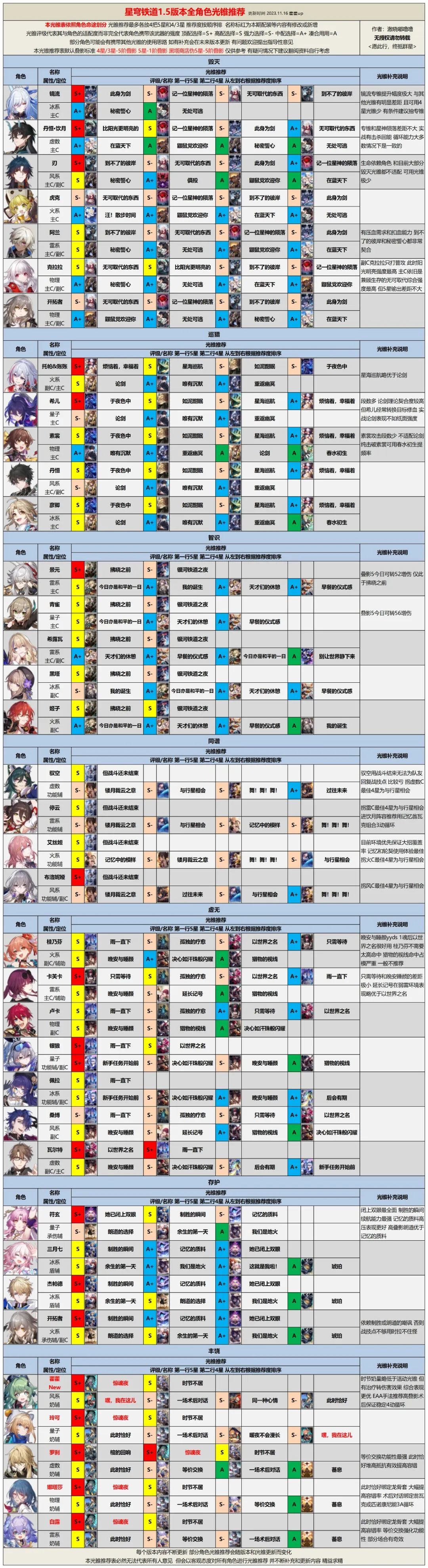 各位开拓者好,我是澈晓。 今天带来的是1.5版本全角色光锥遗器推荐! 1.5版本上半虽然只新增了一位新角色藿藿,在武器方面基本只有丰饶角色发生了一定变动,但同时实装了4套全新遗器,对目前各类型角色的遗器搭配都产生了一定影响。 这4套新遗器的强度都还不错,不过针对性也都显而易见的强,套装基本都服务于特定打法。新遗器的分析就不做了,套装指向性已经过于明显,再多的分析最后也都是总结一下这类型打法的角色有
