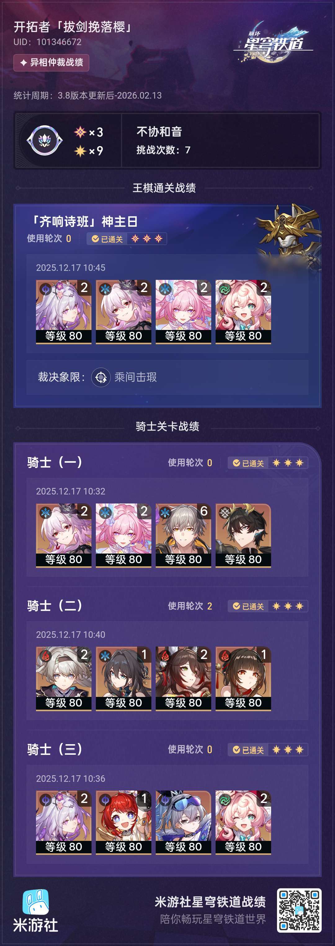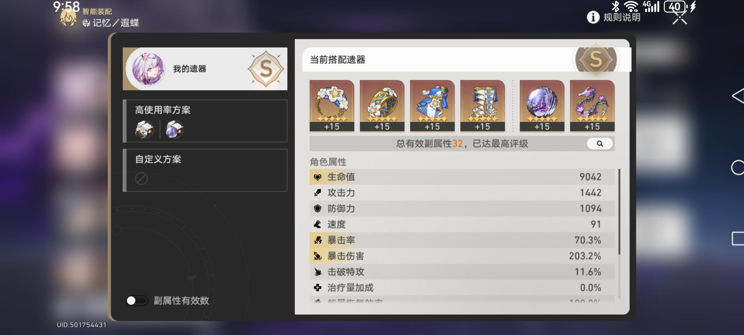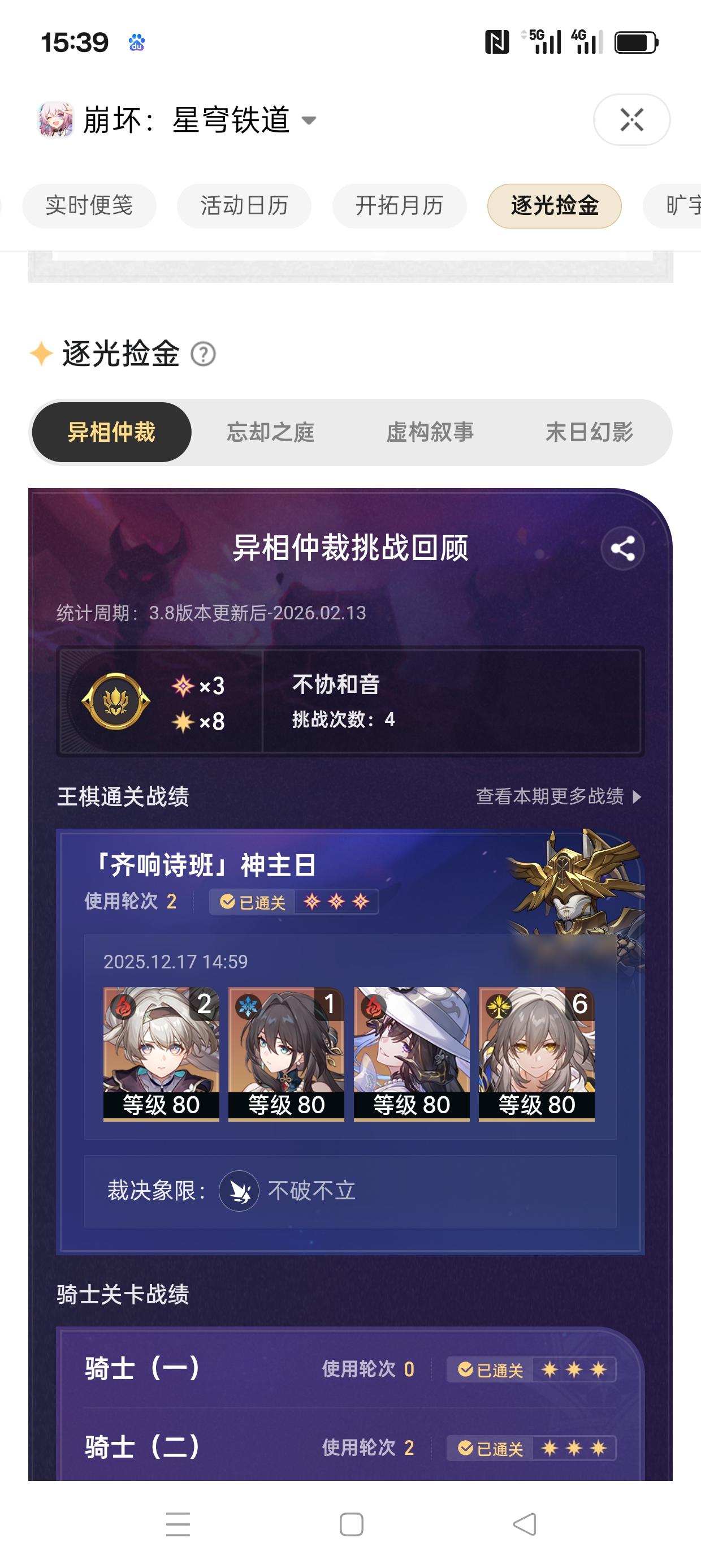 21蝶风昔,11月。遗器词条蝶32,风34,昔35,月38。异相仲裁这个模式2风和2月重要性越来越明显,三月没有二命太容易断大招了。凹了好多遍才2t。换成21月11昔甚至01昔都应该容易过一些。等三月七复刻了,看看膨胀程度,看看是不是补个2命吧。