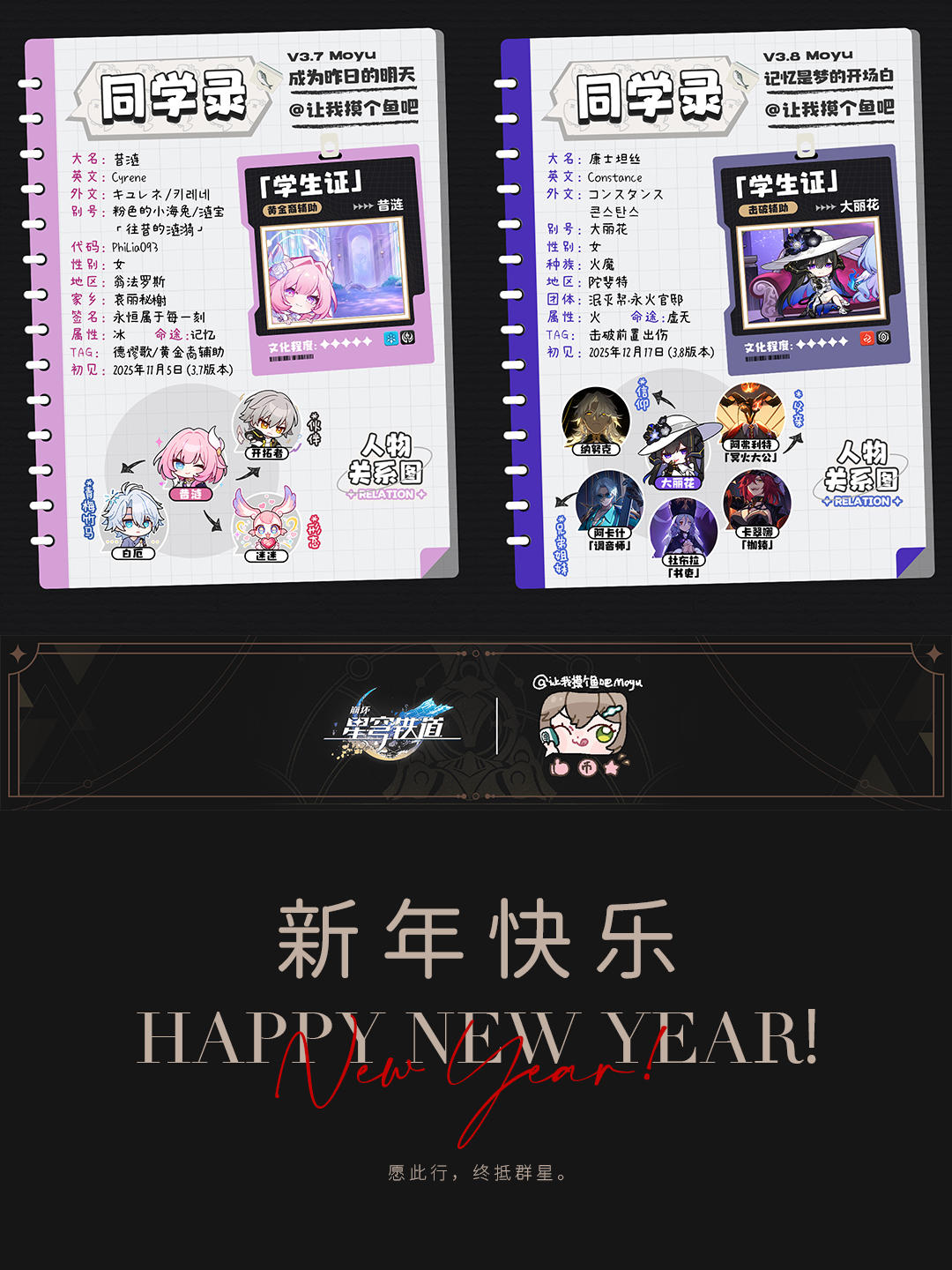 UID:104347362新年快乐!盘点了一下今年一整年的《摸鱼笔记》,大家是从哪一篇认识我的呢?感谢一直陪伴着我的所有,2026我会加倍努力!🐎🥹😭😭😭带着感恩的心情跨年,三二一牢鱼上工!!!🚄我会和大家一直开拓下去 4.0冲鸭!#崩坏星穹铁道 #崩坏星穹铁道创作者激励计划 #崩坏星穹铁道攻略 #星穹铁道大丽花 #记忆是梦的开场白 #摸鱼笔记