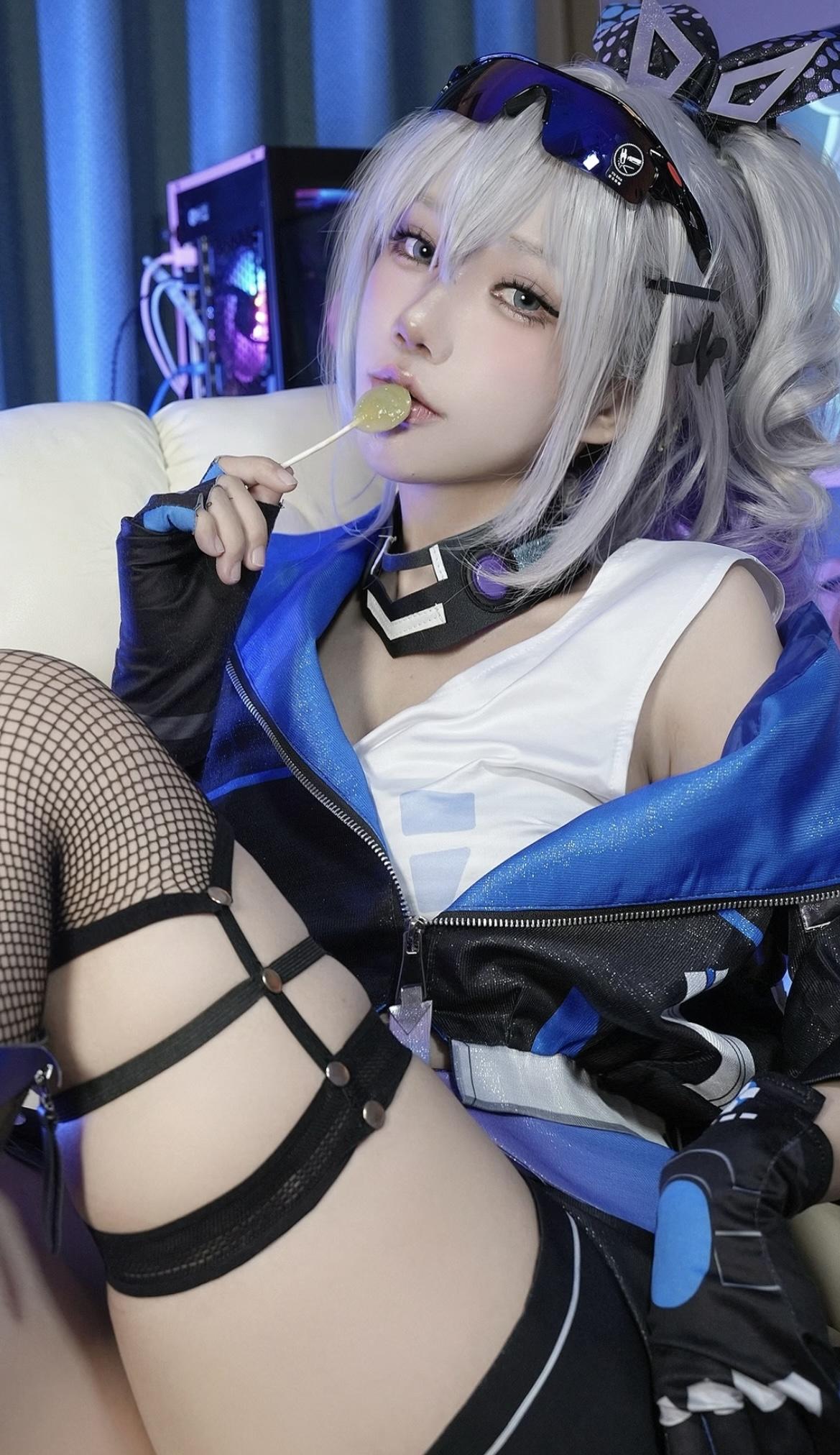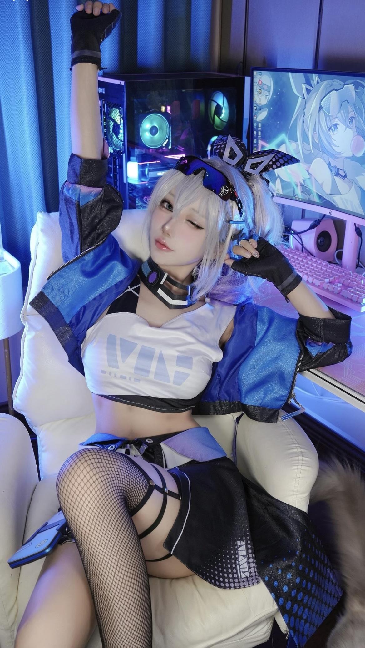 uid:100512025这组银狼的cos堪称神还原!银灰色的卷发蓬松又有层次感,完美复刻了角色的发型特点,头顶的墨镜与机械发饰细节满满,一眼就能认出角色身份。妆容上眼妆的精致度拉满,眼尾的点缀让眼神多了几分狡黠与叛逆,叼着棒棒糖的动作更是把银狼的俏皮与玩世不恭展现得淋漓尽致。服饰的蓝黑撞色、渔网袜与绑带的搭配精准还原角色穿搭,布料的质感和剪裁也很用心,整体造型既还原了游戏里的赛博朋克风格,又通