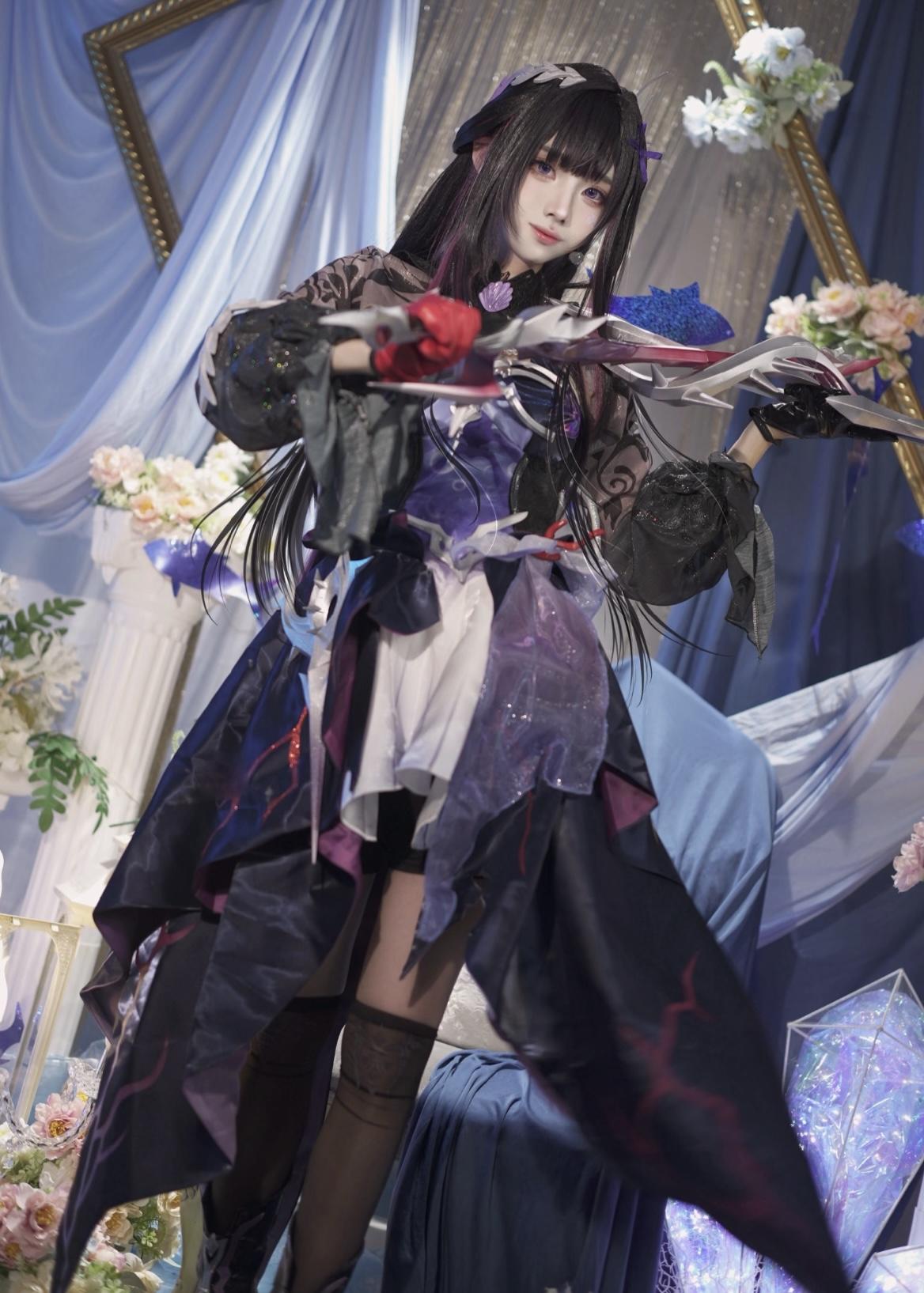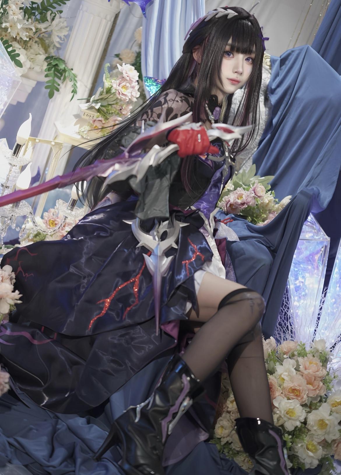 uid:100512025这组cos直接把角色的魅力展现到了极致!造型上完美复刻了角色的服饰细节,深色系的服装搭配紫色装饰,层次感十足,红手套、黑丝与高跟靴的搭配精准戳中角色特质,发丝的造型和配饰的点缀也毫无违和感。场景布置更是氛围感拉满,蓝白色的纱幔、繁花与水晶装饰交织,和角色的气质相得益彰。pose的设计也超有巧思,抬手的动作灵动又优雅,把角色的独特韵味诠释得恰到好处,这沉浸式的cos体验真