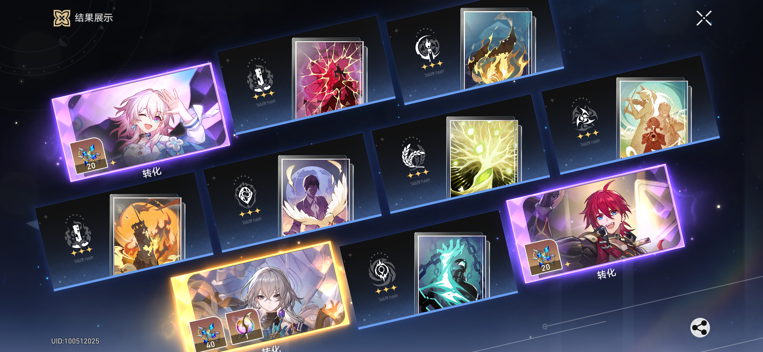uid:100512025这张星穹铁道的抽卡截图也太让人羡慕了!金光闪闪的布洛妮娅卡面瞬间抓住眼球,还有三月七、丹恒的紫色光锥卡相伴,满屏的欧气都要溢出来了。色彩搭配上,深邃的蓝黑背景衬得紫卡金卡的光效格外璀璨,角色立绘的细节也清晰灵动,三月七的俏皮、丹恒的飒爽、布洛妮娅的优雅都完美展现。抽卡能抽出这样的“大满贯”画面,不仅是运气的体现,画面本身的视觉冲击力也拉满,每一处卡牌的排布和光效都透着游