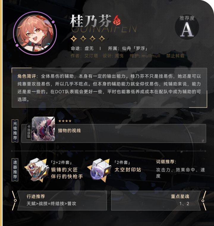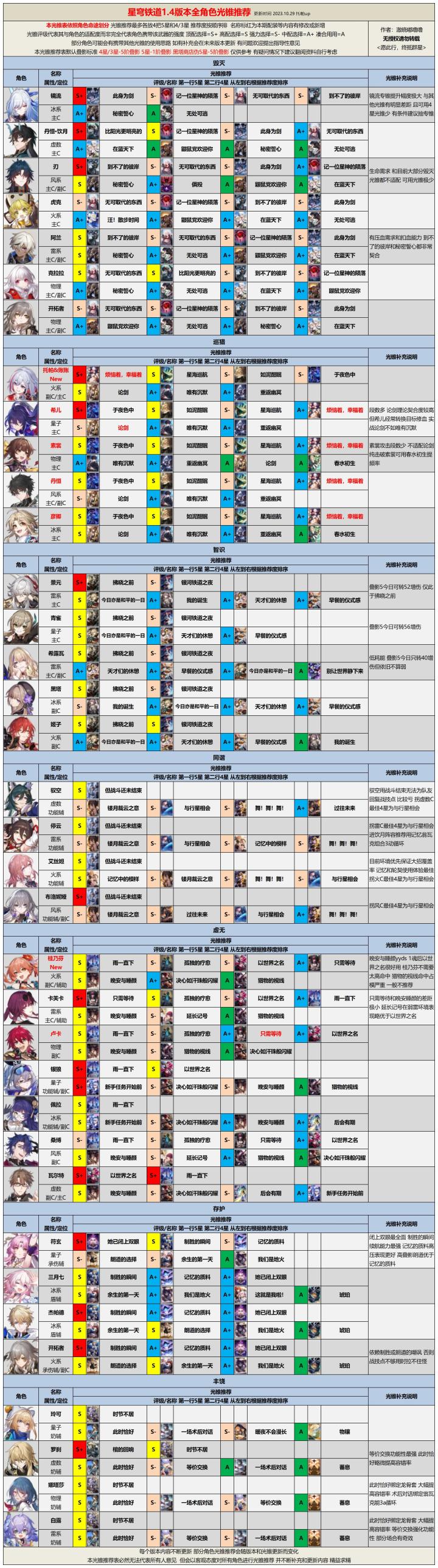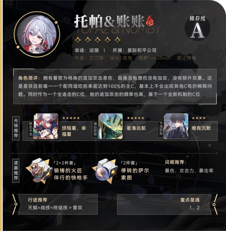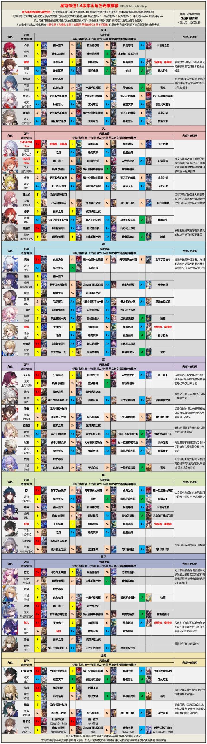 UID 100760002各位开拓者好,我是澈晓。今天带来的是1.4版本上半全角色光锥遗器推荐!1.4下半版本实装了2位火系新角色,托帕&账账以及桂乃芬,虽然近期托帕的强度饱受争议,但相信依旧有不少开拓者会比较关心托帕的配装思路,桂乃芬的热度反到出乎意料的很高,可想而知培养一位会给闺蜜胸口碎大石的女孩子是多酷的一件事。那么托帕&账账和桂乃芬应该如何配装?其他角色的配装细节在近期又是否有新的