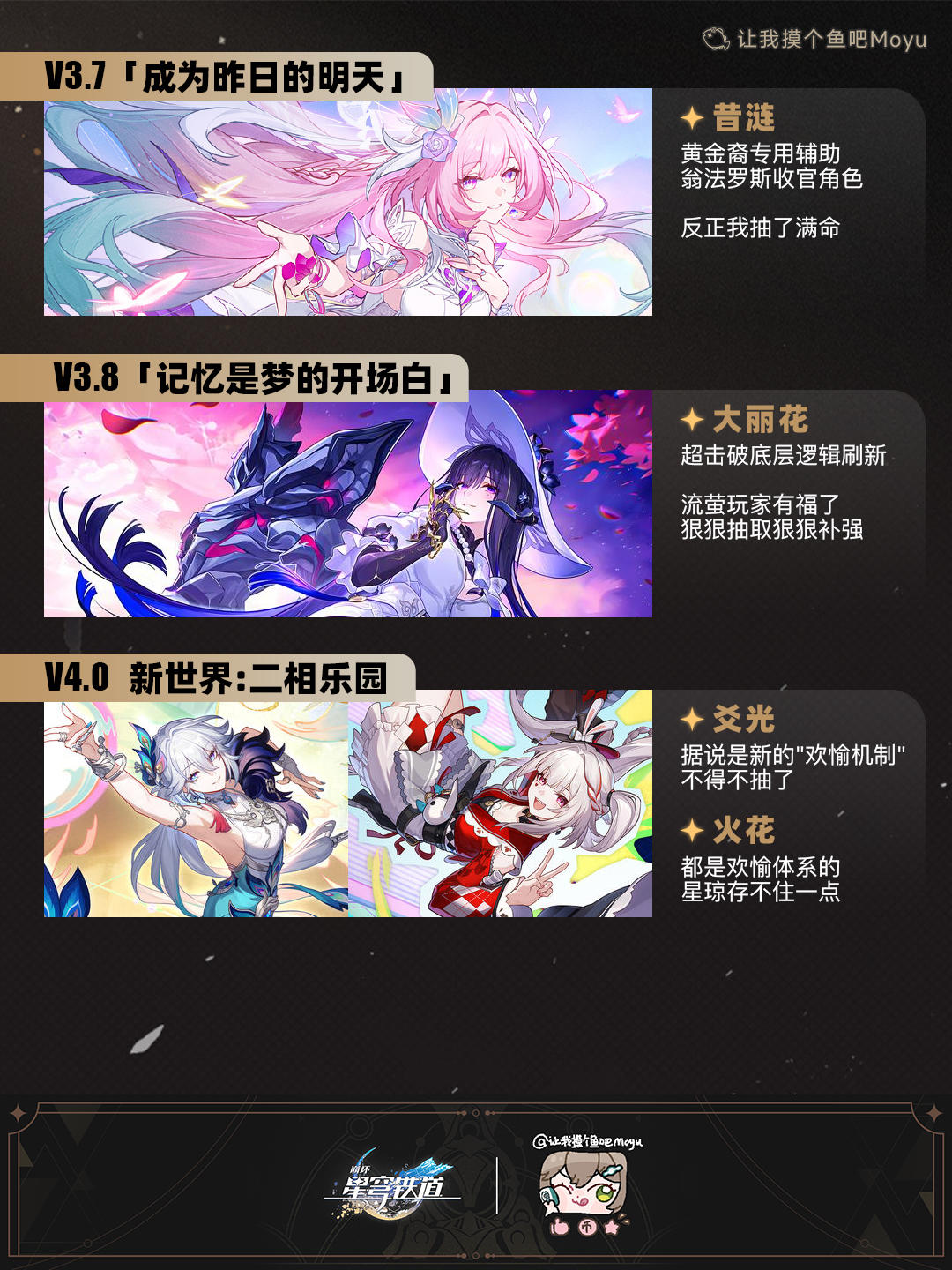 UID:104347362将将!摸鱼驾到!(。•̀ᴗ-)✧到了年末大总结时间,盘点了一下从开服至今的卡池简单概括了下心路历程,给出一些"如果当时"这样的建议!可以给刚入坑的玩家一些参考,也可以和老玩家们互相分享体验心得btw,仅强度方面考虑,xp永远优先哦#崩坏星穹铁道 #崩坏星穹铁道创作者激励计划 #崩坏星穹铁道攻略 #记忆是梦的开场白 #让我摸个鱼吧